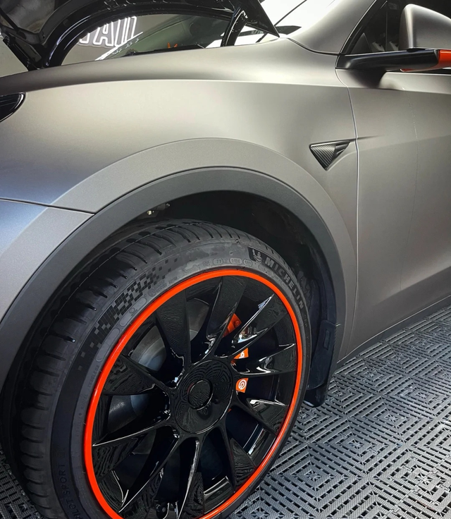 特斯拉modelY20寸轮毂看过来 提醒买特斯拉的朋友千万千万千万要注意 就是20寸轮毂太容易刮蹭了 在我们车友群里,提车一段时间的没有一个幸免的 不管是老司机还是多小心莫名其妙的就有划痕。本人开了一周发现左后轮也被蹭了,从没有过侧方位停车,开的也小心翼翼,也算老司机了。由于是强迫症,花了550元修复了轮毂边缘,吃一堑长一智,立马买了轮毂保护圈。和车标车把手配上了颜色。这东西见仁见智吧,我觉得好不好看不重要了,真不想再刮轮毂了,好多车友提车就装了,我后悔没早点装! 说白了就是20寸轮毂是扁平胎,轮胎边缘是往里凹的,根本没办法包裹保护着轮毂边缘!!开久了难免有剐蹭。