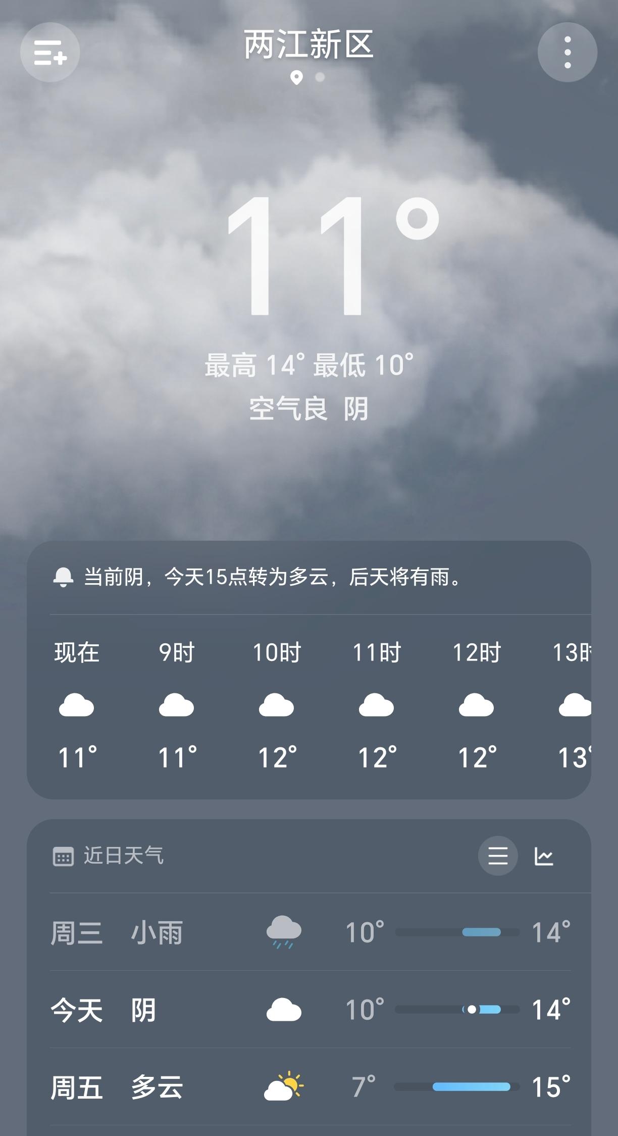今天看天气预报的时候,突然发现江北区已经自动换成两江新区了,江北再也不见了,天气还是阴天,温度变化也不大。 我的今日状态:😁轻松愉快 我这里的天气:☁️阴天