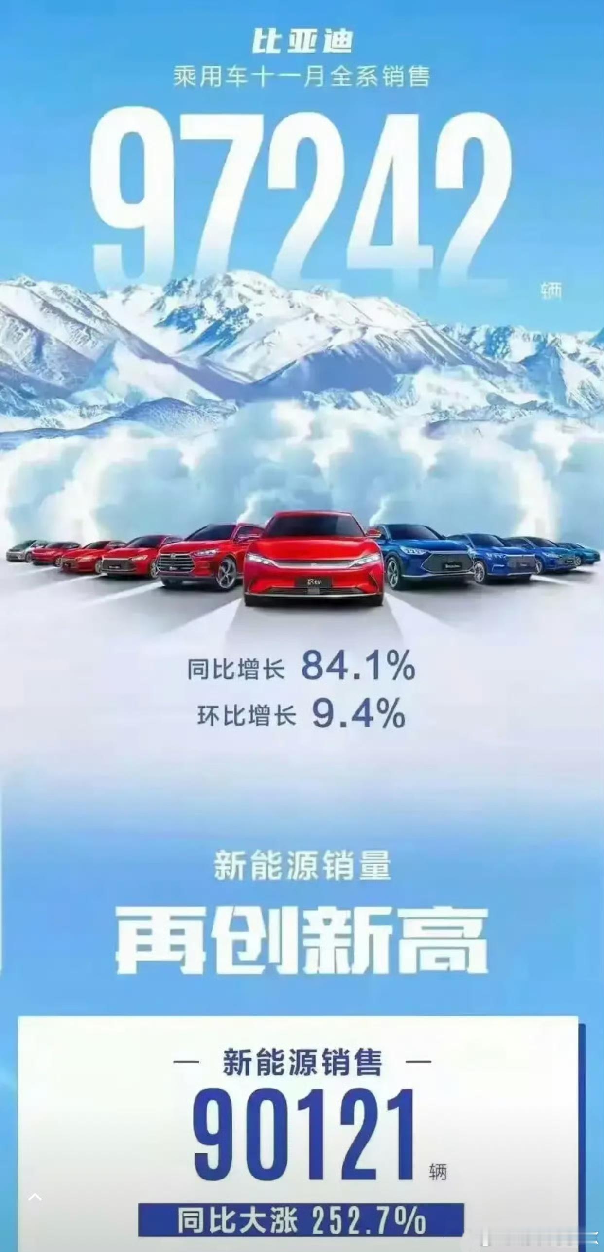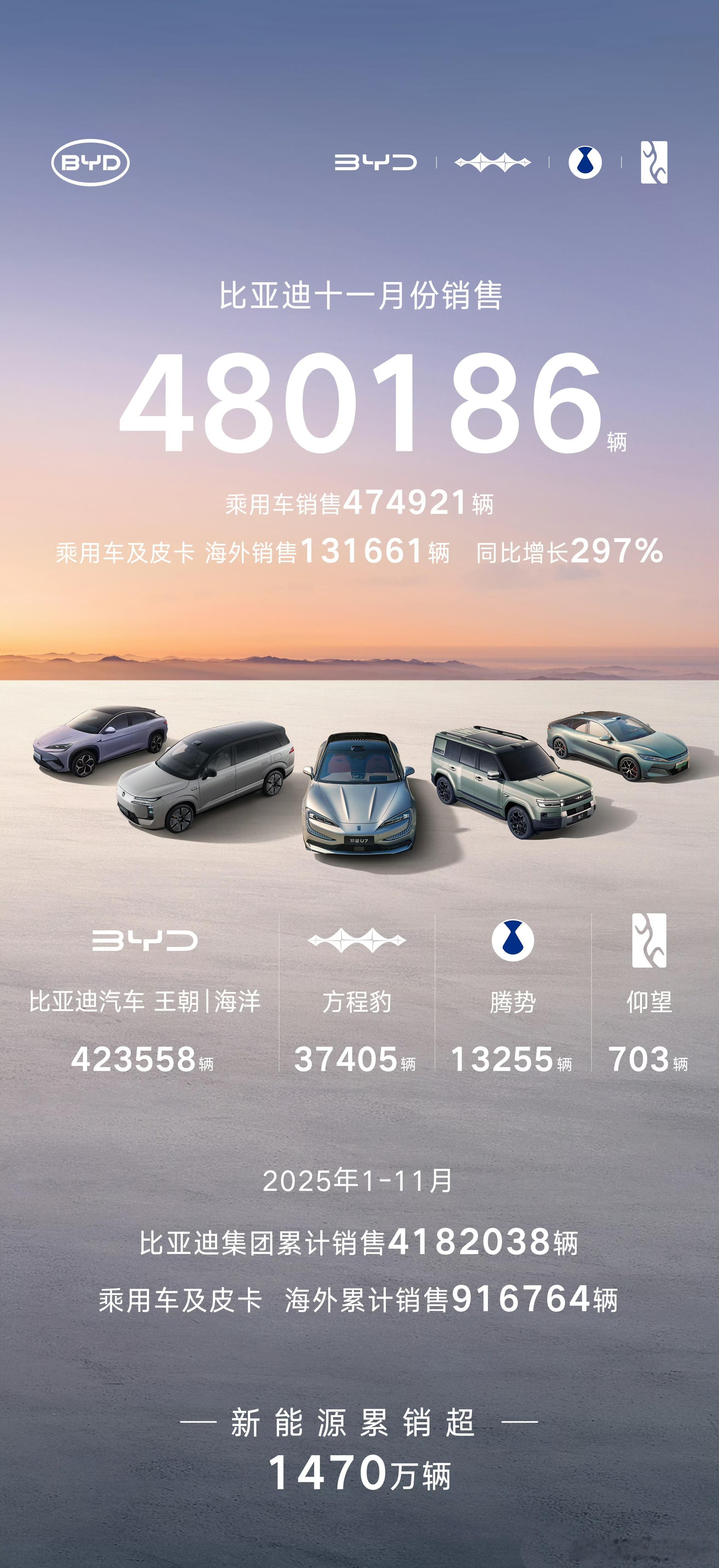 2025年11月,销售480186辆新能源车;2021年11月,销售90121辆新能源车;短短四年时间,告别燃油车,全面拥抱新能源,月销量增长数倍,比亚迪了不起!
