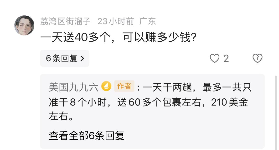 一位叫美国九九六的朋友在美国送快递,一天最多可以工作八个小时,大约送60个包裹,