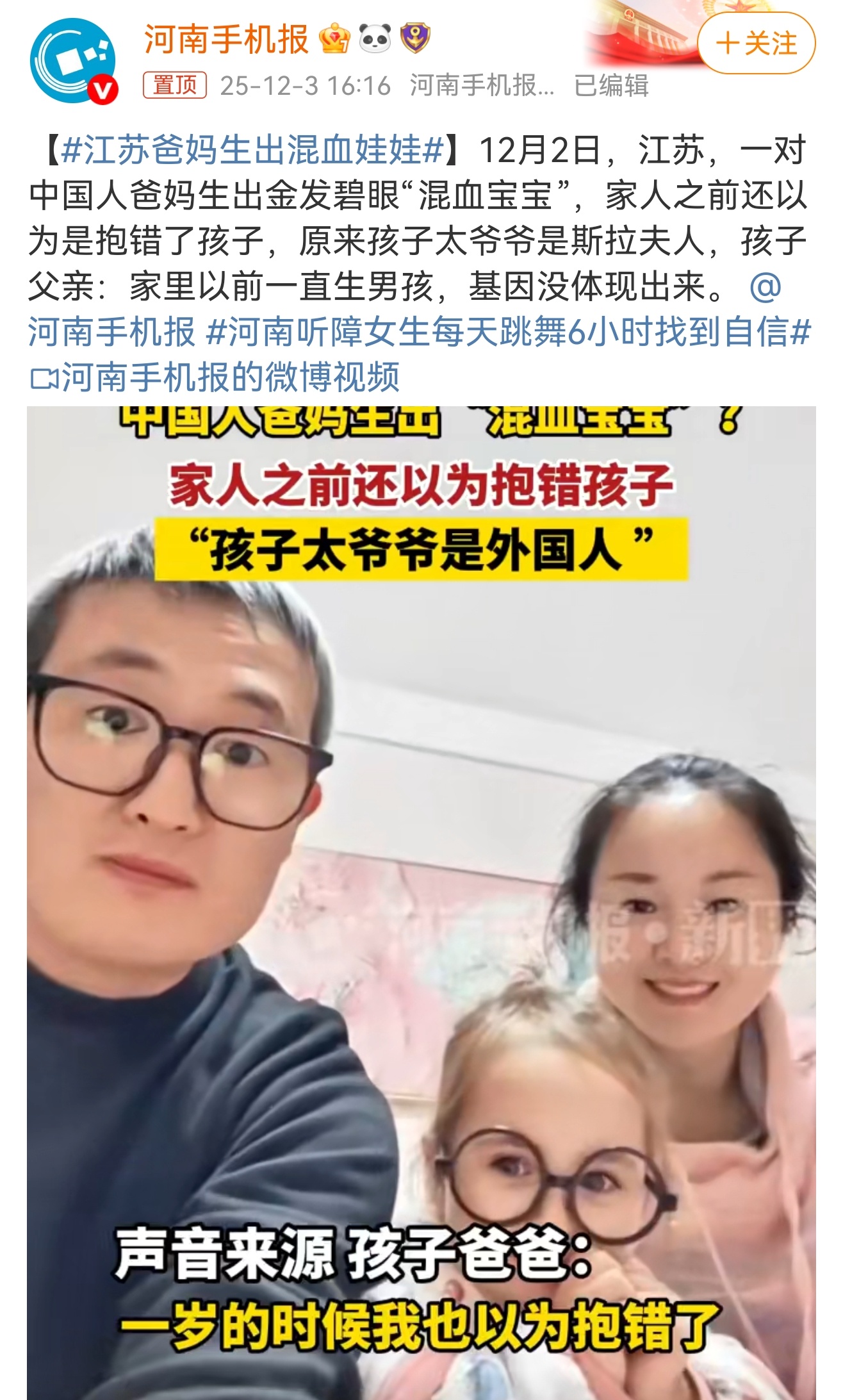 江苏爸妈生出混血娃娃孩子太爷爷是斯拉夫人,所以这就不奇怪了,隔了好几代还遗传了否则,问题就大了,那不得好大一顶绿帽子?