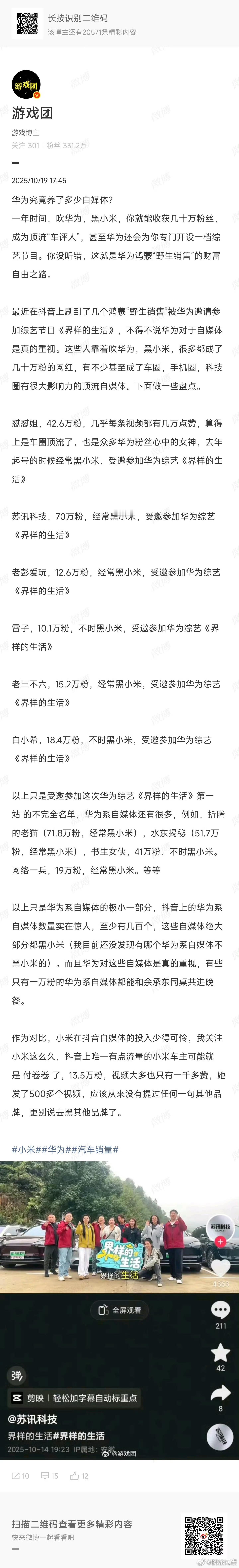 这说的纯粹造谣了…管哥那边我很熟,他们都是鸿蒙智行的车主平时大家也没啥事,有闲有钱所以就大家自己花钱请团队做了个节目纯粹是自己想玩一玩顺便拍点内容和华为一点关系没有…多了解了解就知道了鸿蒙智行车主人群高净值占比比较高不是什么都是华为投放的别什么事都赖华为鸿蒙智行