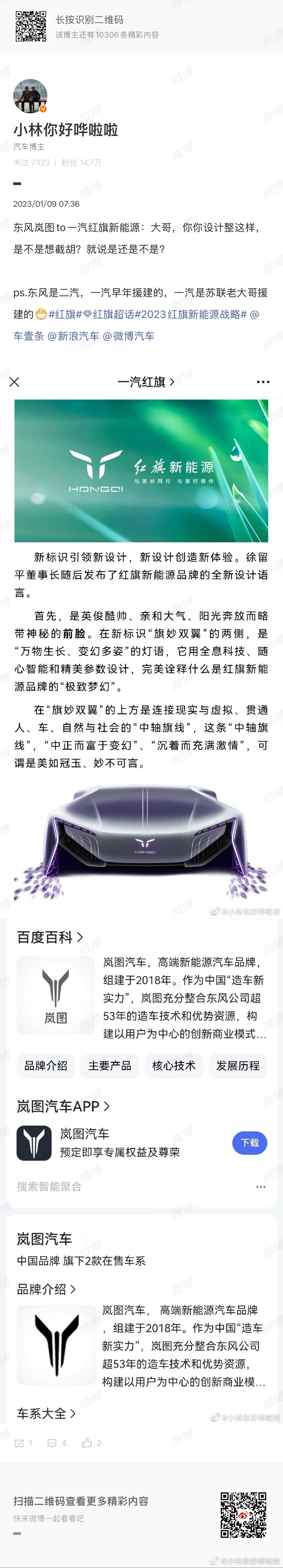 从一汽内部传出消息:红旗新能源放弃之前发布的logo标识,这样就不用担心会跟之前岚图发布的logo标识“撞车”了。这个问题,我两年前就吐槽过(见图8微博)。当然,主要是红旗新能源这个细分品类彻底没了。因为,红旗品牌也放弃了之前按照能源形式划分品牌类别的运营模式,现在的最新品牌架构已经调整为:1、红旗品牌 主流豪华(高档车)车市场,对标BBA2、红旗·天工 拥抱更年轻消费群,拓展破圈用户3、红旗·金葵花 超豪华车市场,对标宾利劳斯莱斯而在此之前,红旗品牌的产品系列划分是:红旗节能车:燃油车+混动红旗新能源:红旗纯电产品红旗金葵花:红旗超豪华车红旗新能源logo之前率先搭载在红旗天工系列纯电产品上,放弃这个logo意味着,全新的红旗天工系列(已经升级为独立子品牌)将换标。另外,跟品牌架构焕新同步进行的,还有另外两个不为人瞩目的改变:第一,红旗品牌原来的slogan“让理想飞扬”弃用,取而代之的是另外一句话:让出行更安全,让生活更美好!新logo平实表达,不沉迷宏大叙事。第二,红旗品牌目标用户群的描述,也从之前的“中国新高尚情怀人士”调整为“新高尚情怀人士”,去掉中国意在剑指全球。红旗 北京·首都机场T3航站楼
