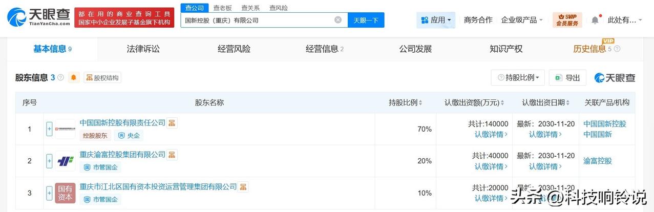 【中国国新等在重庆成立控股公司 注册资本20亿】 天眼查App显示,近日,国新控股(重庆)有限公司成立,法定代表人为辛厚东,注册资本20亿人民币,经营范围为以自有资金从事投资活动、自有资金投资的资产管理服务、咨询策划服务、企业管理咨询、信息咨询服务、社会经济咨询服务。股东信息显示,该公司由中国国新控股有限责任公司、重庆渝富控股集团有限公司、重庆市江北区国有资本投资运营管理集团有限公司共同持股。 天眼查信息: