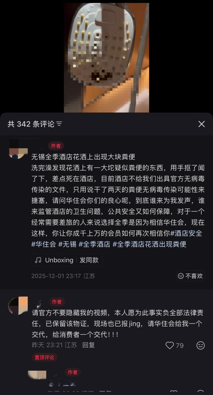 “太恶心了!”江苏无锡,男子一家人去酒店入住,晚上洗澡时,男子偶然发现花洒上面有异物,他还以为是水渍,就用手抠了一下,可他闻了一下手,当场意识到不对劲,这哪是水渍,明明是粪便,当时整个人都不好了。 11月28号晚上8点多,欧女士拖着行李箱走进全季无锡苏宁广场东林书院地铁站酒店的大堂,连续开了三个小时的车出差,她只想赶紧洗漱休息。 办理入住时,前台递过房卡说“房间刚打扫完,放心住”,她没多想就拖着疲惫的身体上了楼。 进房后,欧女士先检查了床品,没发现明显污渍,就匆匆去了浴室,因为她高度近视,摘下眼镜后眼前一片模糊,只凭着手感摸到花洒打开热水。 水流冲过身体时,她隐约觉得花洒上有块凸起的东西,但以为是水垢堆积,加上深夜实在困倦,洗完澡就擦干上床睡了。 当时她完全没料到,这个被忽略的“小细节”,会在第二天引爆一场让全家崩溃的风波。 11月29号晚上7点,黄先生带着老人和孩子赶到无锡,把家人安顿在隔壁房间后,他拿着妻子的房卡去洗漱,连续开车赶路,浑身都是汗味。 黄先生有两百多度近视加散光,洗澡时没戴眼镜,只觉得花洒上那块黑色污渍比妻子说的“水垢”更明显些。 当时水流挺大,冲得花洒晃来晃去,我心想等洗完澡再擦干净吧,他后来跟记者回忆,等关掉热水擦身子时,黄先生顺手伸过手去抠那块污渍。 可指尖刚碰到,就觉得不对,不是水垢的粗糙质感,反而黏黏的、带着点弹性,他下意识地把抠下来的一小块凑到鼻尖,一股浓烈的、带着腐臭的异味瞬间钻进鼻腔。 黄先生猛地把手里的东西甩在地上,慌忙打开冷水冲手,脑子里一片空白,那味道太冲了,跟厕所里的气味一模一样。 黄先生说,他当时光着身子站在浴室里,足足愣了半分钟才反应过来, 那是排泄物。更让他头皮发麻的是,他突然想起妻子昨晚也用这个花洒洗了澡,而自己手上还带着白天搬行李蹭破的伤口,妻子脚上也有新鞋磨的泡,创可贴洗澡时早就泡掉了。 黄先生裹着浴巾冲出浴室,声音都在发抖,你昨天用花洒洗澡,有没有觉得不对劲?欧女士被他吓了一跳,听清原委后,当场就冲进卫生间干呕起来。 我近视度数高,洗澡根本看不清,现在想想,水从花洒流下来的时候,那东西说不定就跟着冲过全身了,欧女士的声音里带着哭腔。 夫妻俩没敢耽误,立刻打电话叫了酒店工作人员。 第一个赶来的是负责楼层清洁的阿姨,她弯腰看了眼花洒上残留的痕迹,脸色瞬间变得惨白,掏出手机拍了张照片就往门外跑,嘴里念叨着“我得赶紧找经理”。 十多分钟后,一位穿西装的经理跟着阿姨过来了,他捏着鼻子凑近看了看,没先道歉,反而皱着眉问,您爱人昨天入住时没发现,今天才说,会不会是中间有人进来过? 这话彻底激怒了黄先生,我们夫妻俩带着老人孩子,没事干会拿这种事讹你们?我可以发誓,要是这东西是我们弄的,我愿意负全部法律责任! 经理被他怼得说不出话,才勉强表示“先去医院检查,费用酒店出”,当晚10点多,酒店派车送夫妻俩去了附近的医院。 抽血时,医生的话让他们刚放下的心又悬了起来,粪便里可能有甲肝、诺如病毒这些,很多都有潜伏期,现在查不出来,得等一个月后复查。 从医院出来时已经凌晨,黄先生跟经理提出,希望酒店能找权威机构出个证明,确认那些东西没有传染性,再书面承诺如果复查出问题酒店负责。 可经理支支吾吾半天,只说“我们不是鉴定机构,开不了证明”,愿意退当晚的房费作为补偿。 我差那几百块房费吗?黄先生拒绝了,我要的是安心,是万一真得了病有人负责,不是退钱了事。 直到凌晨一点,酒店方面还是没给出明确答复,只说“已经报警了,等警察调查”,黄先生夫妻俩坐在空荡的酒店房间里,看着浴室紧闭的门,一夜没合眼。 黄先生说,我们选择全季,就是觉得连锁品牌卫生有保障,没想到会出这种事,更没想到酒店第一反应是怀疑我们,不是解决问题。 第二天上午,涉事酒店的徐姓店长联系了黄先生,还是那套说辞,我们愿意承担复查费用,但证明开不了,承诺也没法写。 而全季所属的华住集团客服,也只给出“正在调查”的模糊回应,而警方仍在调查异物来源,但黄先生夫妻俩的担忧丝毫未减。 这场从深夜疏忽开始的惊魂事件,暴露的不仅是酒店清洁流程的漏洞,更是面对消费者权益受损时的责任缺失。 对夫妻俩来说,花洒上的污渍能擦掉,但心里的阴影和对连锁酒店的信任,恐怕很久都难以恢复。 毕竟,每个选择酒店的人,买的从来都不只是一张床位,更是一份“住得安心”的承诺,当最基本的卫生底线被突破,再响亮的品牌口号,也会变得不堪一击。 信息来源:新民晚报2025-12-03发布:在酒店洗澡后发现花洒上粘着排泄物!“抠掉一块闻了下有股恶臭”在酒店洗澡后发现花洒上粘着排泄物!“抠掉一块闻了下有股恶臭”