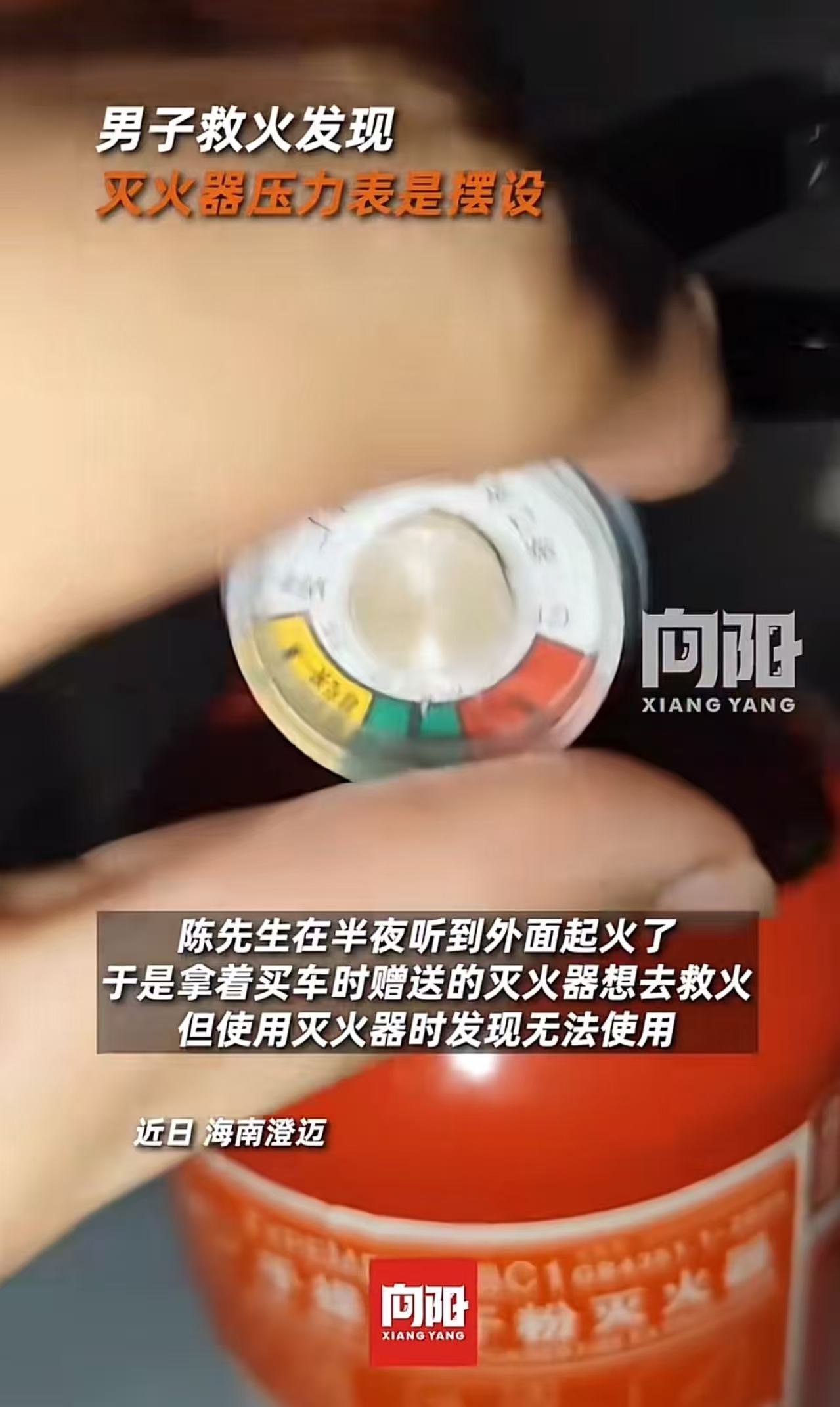 “还有什么不敢造假?”海南,男子半夜听到外面起火了,连忙拿自己车里的灭火器去灭火,结果发现灭火器的压力表是个摆设,根本喷不出来!男子:“灭火器都敢做假,真的太缺德了!”网友:有些中国人真是丧尽天良,这种关乎生命的东西能造假!