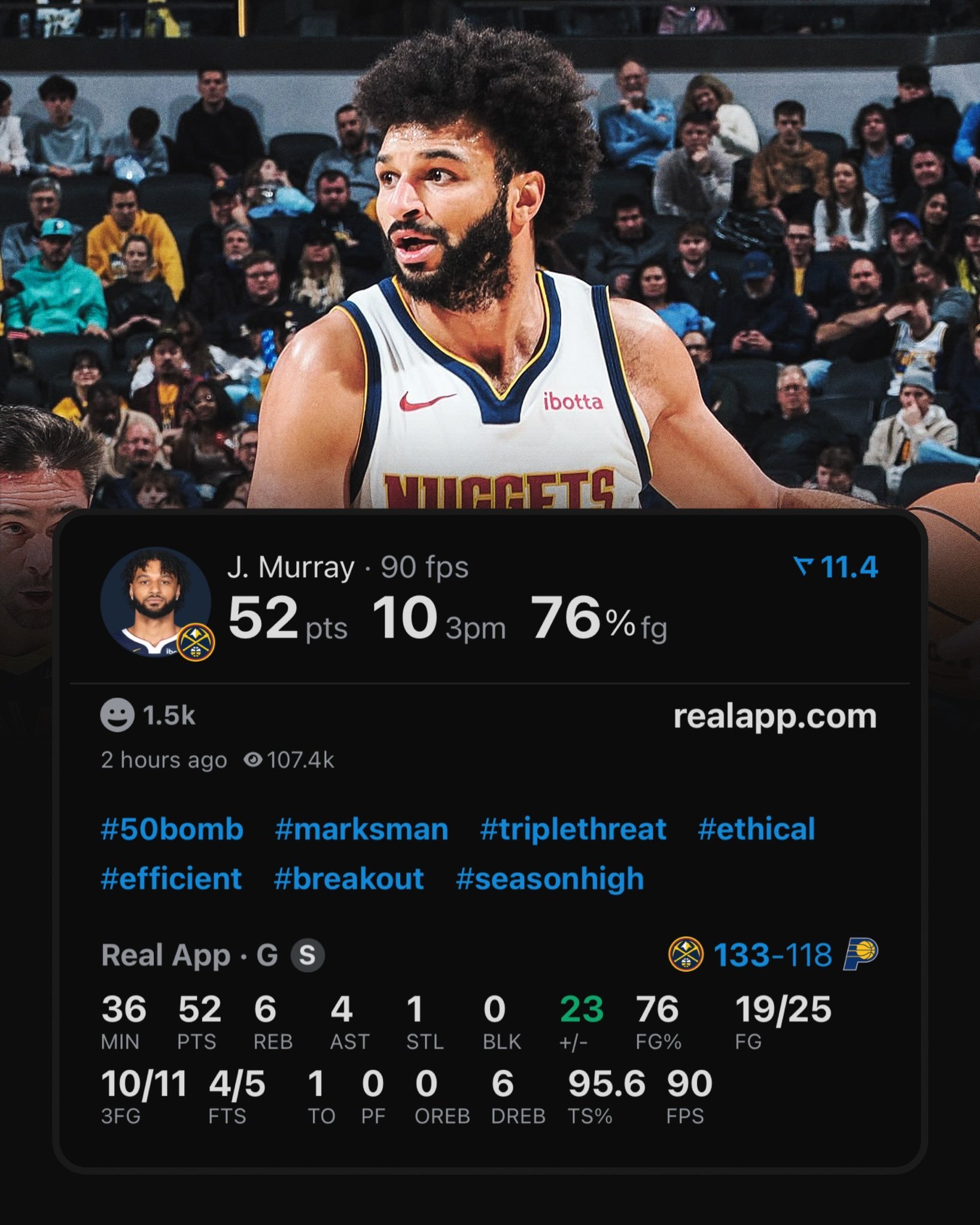 什么水平??今天的穆雷:——投篮29中15,三分11中10,罚球5中4——得到52分6篮板4助攻——真实命中率高达95.6%!!——掘金本赛季第三个单场50+的球员掘金vs步行者