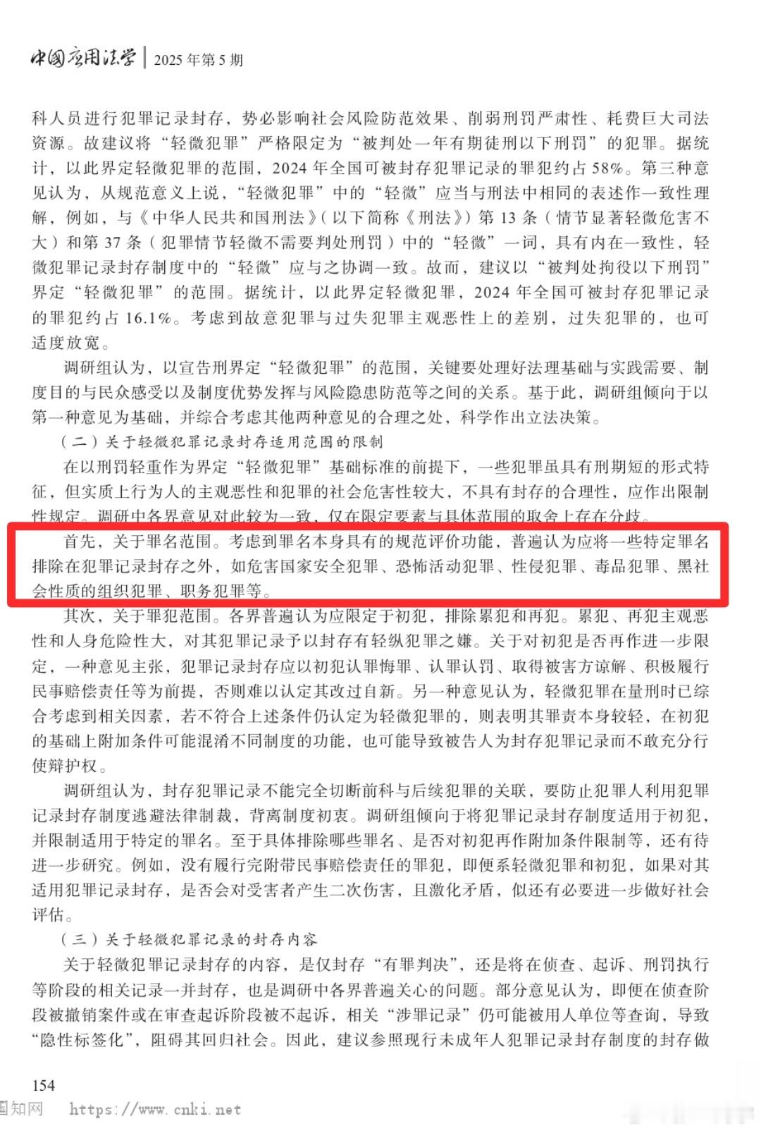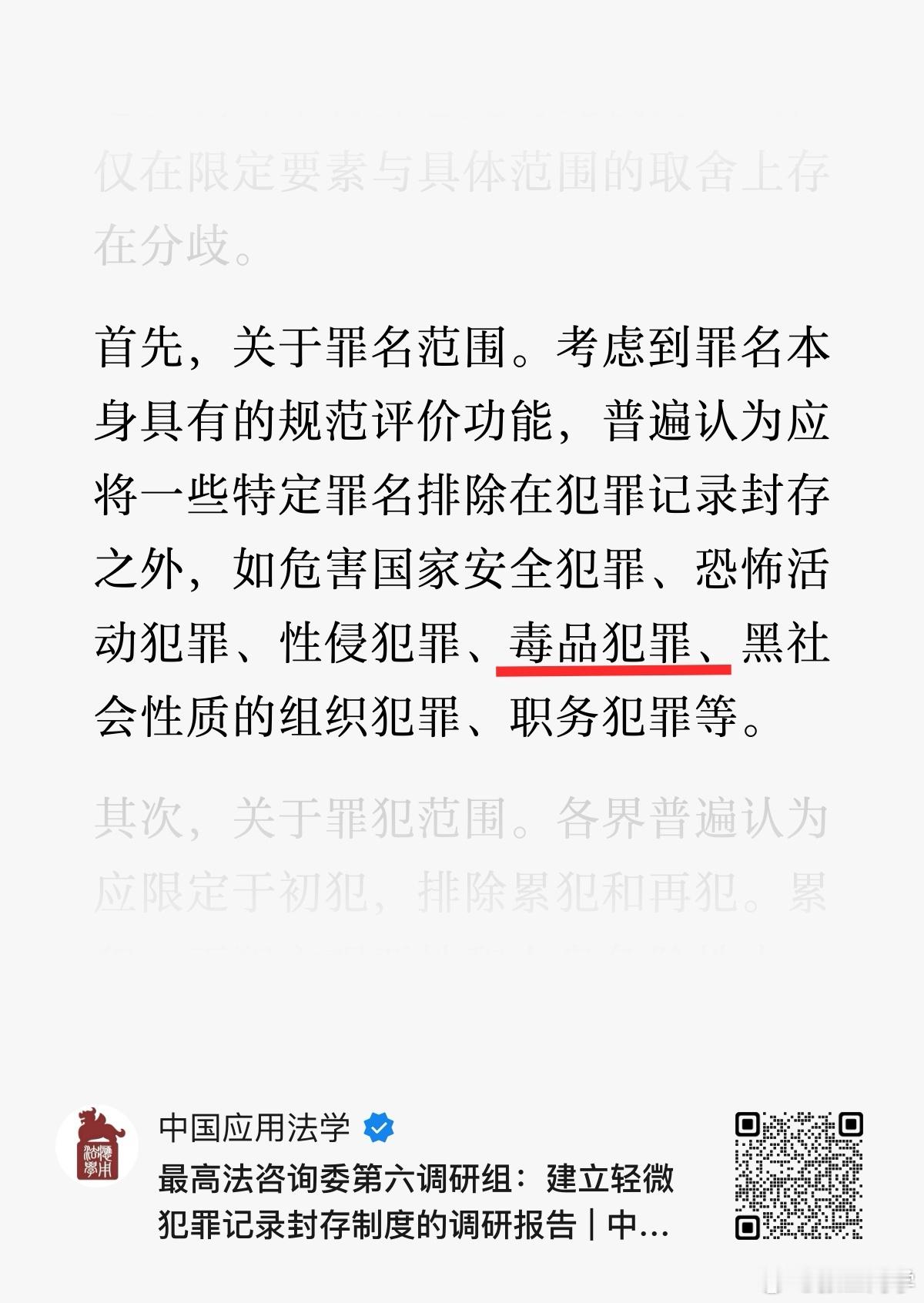 建立轻微犯罪记录封存制度的调研报告关于轻微犯罪记录封存适用范围的限制,在以刑罚轻重作为界定“轻微犯罪”基础标准的前提下,一些犯罪虽具有刑期短的形式特征,但实质上行为人的主观恶性和犯罪的社会危害性较大,不具有封存的合理性,应作出限制性规定。调研中各界意见对此较为一致,仅在限定要素与具体范围的取舍上存在分歧。首先,关于罪名范围。考虑到罪名本身具有的规范评价功能,普遍认为应将一些特定罪名排除在犯罪记录封存之外,如危害国家安全犯罪、恐怖活动犯罪、性侵犯罪、【毒品犯罪】、黑社会性质的组织犯罪、职务犯罪等。以上选自“调研报告”原文……………………………………“轻微犯罪记录可封存”需将特定罪名排除在外,比如:毒品犯罪、性侵犯罪等。而《治安管理处罚法》违法记录封存采取的是“一刀切”,除了吸毒还包括其它涉毒违法行为,完全没考虑涉毒违法行为的特殊性。公众对涉毒违法记录封存的担忧,并不是所谓的“情绪”。禁毒热点观点