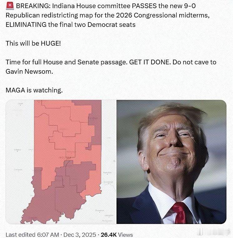外媒:印第安纳州众议院委员会以9:0通过新的共和党重新划分选区方案,备战2026年国会中期选举,彻底砍掉最后两个民主党席位。 这影响将极为重大! 现提交全院和参议院表决。赶紧通过,别向Gavin Newsom让步。 MAGA正盯着。