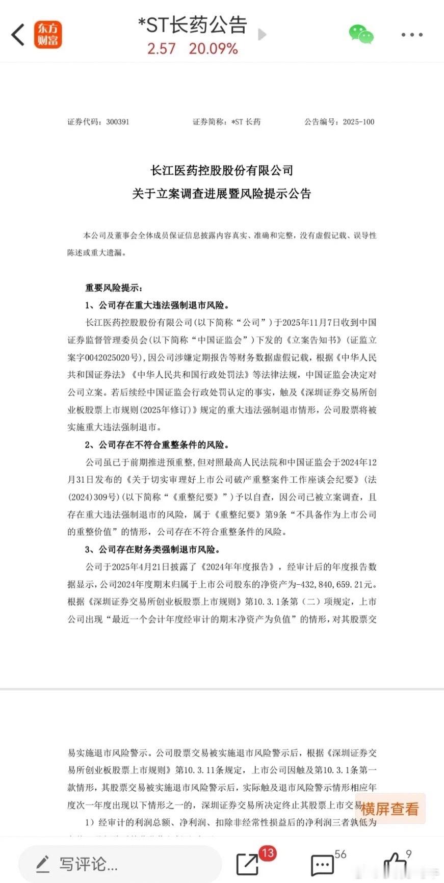 真绝!白天20CM强势涨停,晚上发布重大违法强制退市风险!昨天三大股指全线下跌,收盘时两市有近3900家下跌,14家跌停。而*ST长药却逆势大涨,20厘米强势涨停封板,不少追进去的股民还以为买到了大牛股。结果晚上公司发布公告,提示强制退市风险。公司有三个重要风险提示:1.公司存在重大违法强制退市风险。2.公司存在不符合重整条件的风险。3.公司存在财务类强制退市风险。按照之前退市的公司来看,能发布这三项内容的,还没有不退市的,昨天进场的股民会不会被一锅焖?