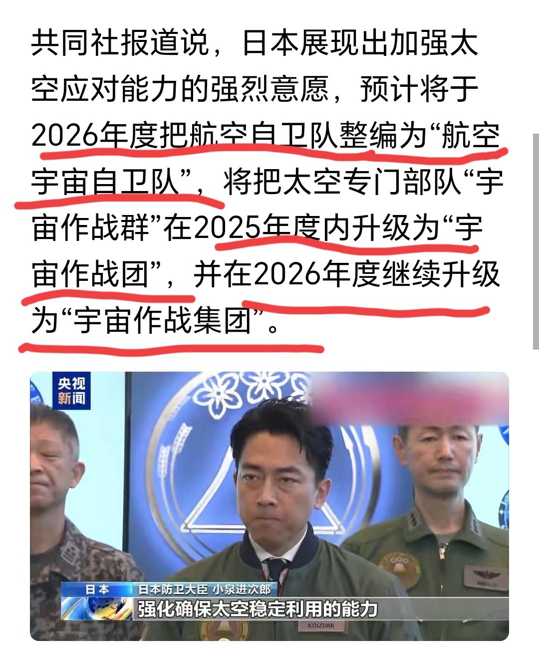 宇宙自卫队?我还差点以为是小西八的。结果是小八嘎的。日本人真的是二次元看多了,已经疯了。 患上被迫害妄想症了。 现在想要做人间大炮吗? 克赛号你们做得出来吗? 先独立做出自己的空间站吧。 看来这是来自车力巨人的指示,既然税宗把国防部改成战争部,那日本就应该把自卫的范围扩展到整个宇宙。 小八嘎这得怕成啥样才这样疯狂。 然并卵。 点右上角关注我,我们一起去看这个魔幻的世界