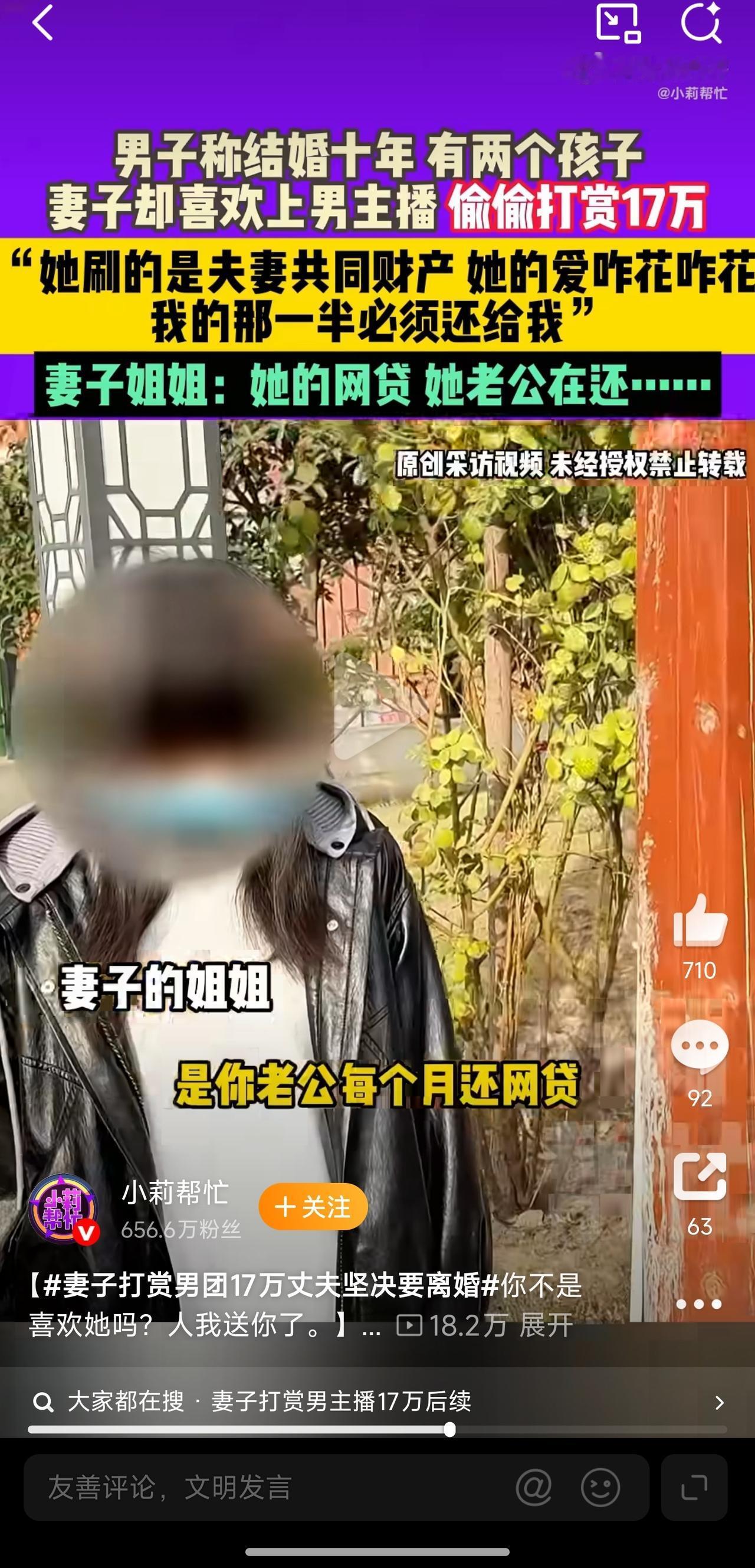 【妻子打赏男团17万丈夫坚决要离婚你不是喜欢她吗?人我送你了。】丈夫扬言要将打赏男主播的妻子送人 12月2日,@小莉帮忙 关注 甘肃吴先生发现发现妻子网贷打赏男团主播17万,并通过外卖地址找到主播所在公司,下午小莉和吴先生见到主播,吴先生情绪比较激动:她有老公,有两个孩子,你喜欢她?人我给你带来了,我们已经离婚,打赏的17万是夫妻共同财产,她的那一半想怎么花怎么花, 我的那一半必须退我。你来的时候2人,现在我老婆送你。男主播回应:喜欢有很多种表达,直播送礼物是她的问题,其他不回答。据了解,目前吴先生和妻子已决定离婚,属于离婚冷静期内,记者也看到吴先生妻子曾和主播发消息称,我离婚了,我来找你了。人可以送你钱必须退一半