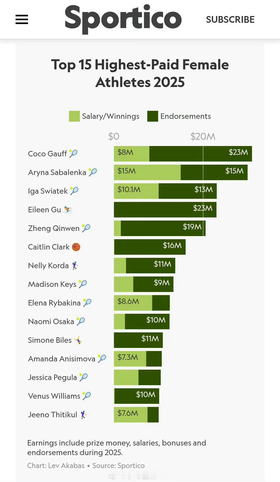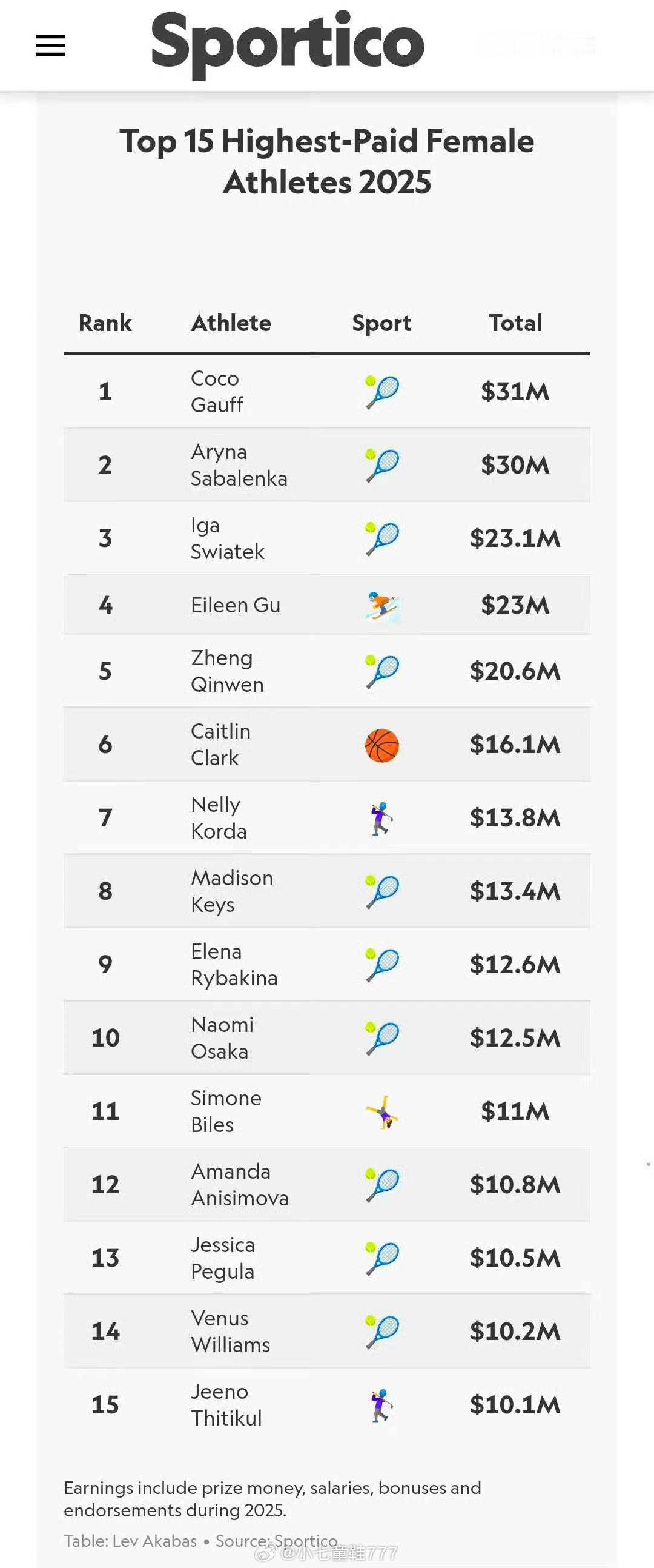 郑钦文全球女运动员收入榜第5美国体育财经媒体《Sportico》发布2025年女子运动员收入榜单,中国运动员谷爱凌和郑钦文上榜,分别排名第4和第5,高芙连续三年蝉联第一名。值得一提的是,排名前15的运动员里有10位女子网球选手。1、🎾高芙:3100万美元2、🎾萨巴伦卡:3000万美元3、🎾斯维亚泰克:2310万美元4、🏂谷爱凌:2300万美元5、🎾郑钦文:2060万美元6、🏀克拉克:1610万美元7、🏌️♀️科达:1380万美元8、🎾凯斯:1340万美元9、🎾莱巴金娜:1260万美元10、🎾大坂直美:1250万美元11、🤸♀️拜尔斯:1100万美元12、🎾阿尼西莫娃:1080万美元13、🎾佩古拉:1050万美元14、🎾大威:1020万美元15、🏌️♀️朱塔妞佳:1010万美元谷爱凌全球女运动员收入榜第4体育共创官体坛风云
