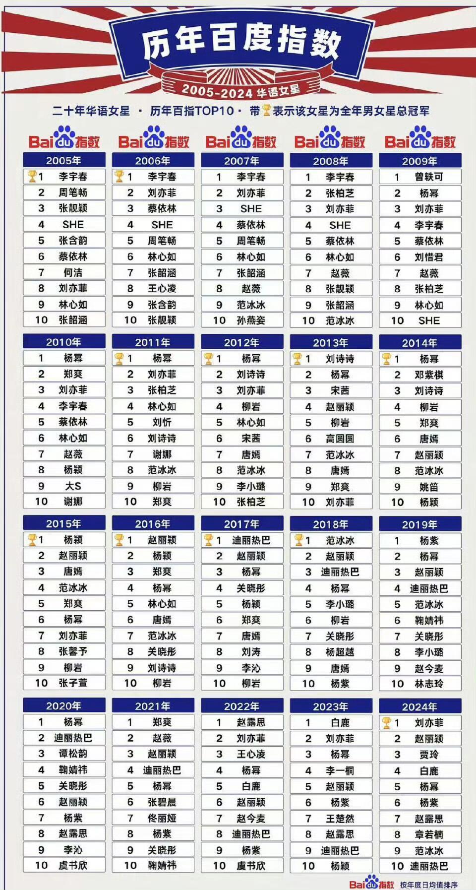 杨幂杨幂生万物 2025演员剧播期百度搜索日均杨幂女星Top12005-2024二十年华语女星百指Top10,杨幂从2009年开始就住在榜上了,而且常年前三