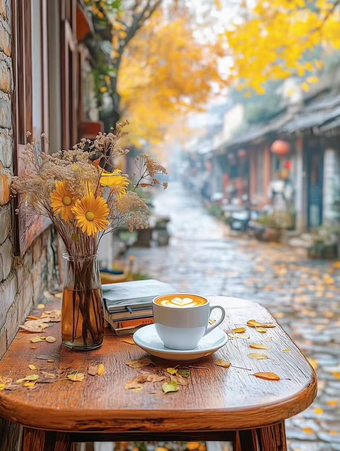秋日暖阳下,一杯咖啡,一束野花,静享悠闲时光。🍂☕️🌼秋日里的咖啡馆自然系