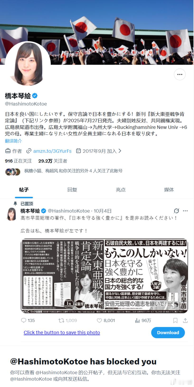 日本知名极右翼作家橋本琴絵:“中国声称要对日本发动核打击。如果他们仅仅在名古屋或博多这样的地区性城市造成几百万人死亡,很容易想象剩下的1亿人会在极度愤怒下做出什么。没有人能想象出1亿人会拥有如此强大的力量,他们心意相通、目标一致......”很容易预测:投降。因为历史上你们就是这么做的。奇怪的是,我是从别人那看到她的内容,我去访问她的主页,发现被她拉黑了,为什么呢?还有那个日本著名汉奸石平也一样,以前没有任何互动,甚至都不认识你们,为什么要拉黑我呢?我很费解啊!