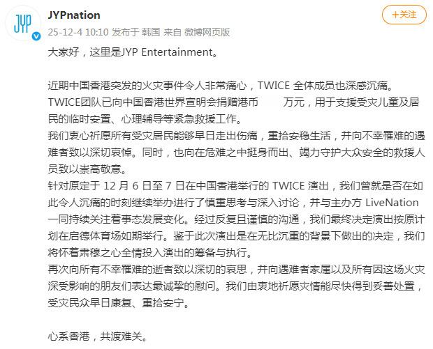 twice向香港捐赠100万港元twice香港演唱会如期举行 “TWICE团队已向中国香港世界宣明会捐赠港币 100 万元,用于支援受灾儿童及居民的临时安置、心理辅导等紧急救援工作。针对原定于 12 月 6 日至 7 日在中国香港举行的 TWICE 演出,我们曾就是否在如此令人沉痛的时刻继续举办进行了慎重思考与深入讨论,并与主办方 LiveNation 一同持续关注着事态发展变化。经过反复且谨慎的沟通,我们最终决定演出按原计划在启德体育场如期举行。”