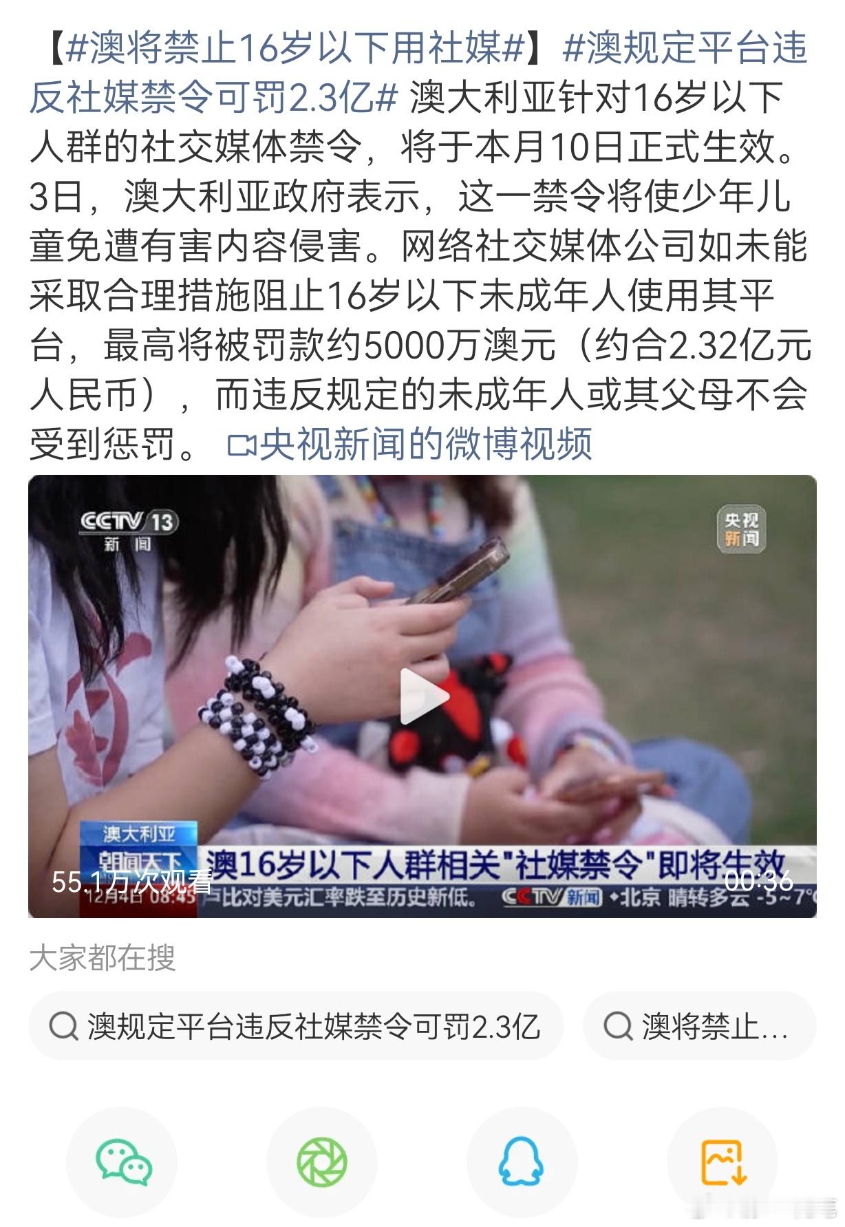 澳大利亚针对16岁以下人群的社交媒体禁令,将于本月10日正式生效。但是罚的是社交媒体,这有点奇怪,是不是他们要按身份证登记,没有实名注册不能用?否则每个媒体平台都可以罚个几十上百亿澳元的。所以这个关键是什么叫合理措施,如果只是一个未满16岁不允许注册,那就是属于那些议员政客在刷吸引眼球的破玩意。当然,我赞成未成年人少用手机和互联网,真的让他们痴迷和沉迷的。