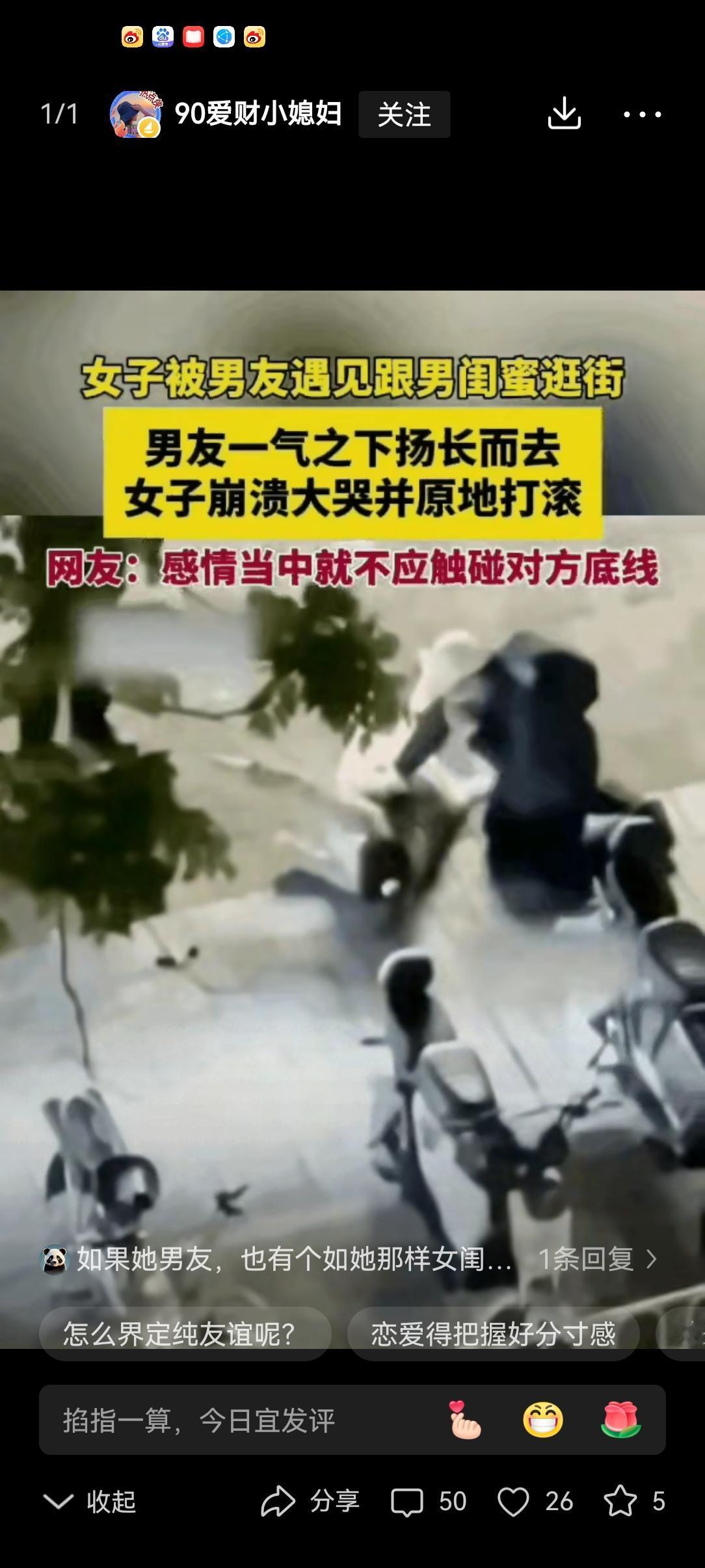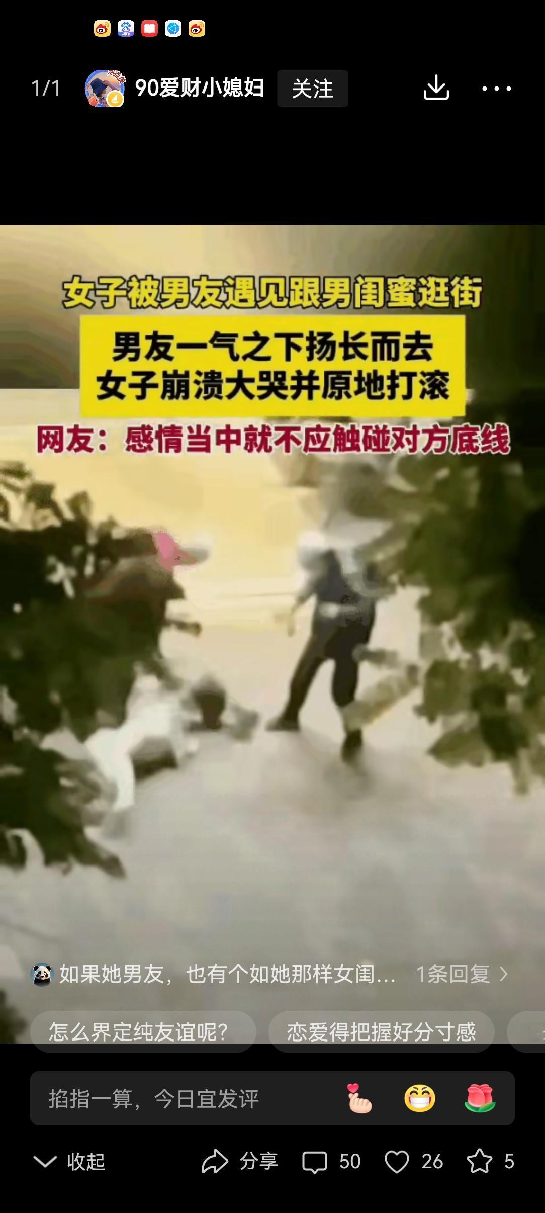 网友吵翻了:女子跟男闺蜜一起逛街,两人并肩走着,边走边聊天举止有点亲密。而这一幕刚好女子的被男朋友撞见了。男朋友看了两人一眼没说话,然后扭头就走了! 昨天刷到个事儿,越看越有滋味,也越看越让人唏嘘。一个姑娘跟所谓的男闺蜜一起逛街,两人肩并肩贴得挺近,凑在一块儿低声说笑,偶尔还会伸手拍对方胳膊,举止透着股不分你我的亲昵。 巧的是,这一幕刚好被姑娘的男朋友撞了个正着。男生站在不远处,没喊她,也没发脾气,就安安静静看了两眼,然后转身就走,背影透着一股说不出的疲惫。 姑娘一开始看见男友还挺开心,笑着就想上前打招呼,见他扭头就走,心里一下子慌了,赶紧快步追上去,拉着他的胳膊问怎么了。 男生这才憋不住火,脸色铁青地质问她:“你不是说没空吗?我让你陪我去买件外套,你说要忙,转头就有空陪他逛街?” 这话一出口,姑娘也来了劲,反驳说就是跟好朋友出来走走,是男生多想了,还抱怨他小题大做、斤斤计较,一点都不大度。 可男生却越说越心寒,他说这不是第一次了,每次男闺蜜一喊她,她总能放下自己,不管是约会到一半,还是自己正需要人陪的时候,她永远优先男闺蜜。 他不止一次跟姑娘说过,不是不让她交异性朋友,只是希望她能有边界感,别让自己难堪、吃醋,可姑娘从来没往心里去。 “我累了,咱们分手吧。”说完这句话,男生轻轻甩开姑娘的手,头也不回地走了,没有一丝犹豫。 姑娘瞬间懵了,看着男生决绝的背影,一下子崩溃大哭,甚至坐在路边的人行道上打滚,嘴里反复念叨着“那只是我男闺蜜啊”“他怎么就不能信任我”。 她到最后都没想明白,自己只是跟好朋友逛个街,为什么男友要闹到分手的地步,觉得两人这么多年的感情,连这点信任都没有。 这事发到网上,网友直接吵翻了,两边的说法各有各的道理。 有网友说,感情里最基本的就是边界感,既然有了男朋友,就该主动跟异性保持距离,这不是限制自由,是尊重。把男闺蜜看得比男友重,换哪个男人都受不了,分手是迟早的事。 也有网友反驳,觉得男生太小心眼,难道谈恋爱就不能有异性朋友了?说白了就是不信任女友,真要是有猫腻,也不会光明正大一起逛街。 其实“男闺蜜”这词,搁以前就是关系好的男性朋友,说是知己也不为过。但感情里的分寸感,从来都不是小题大做。 不是说不能有交心的异性朋友,而是要懂得避嫌,知道什么该做,什么不该做。你把别人的醋意当矫情,把自己的无边界当坦荡,到最后伤的,只能是真心待你的人。 说白了,不是男生斤斤计较,是姑娘没守住底线;不是感情经不起考验,是人心经不起敷衍。 那么问题来了,你觉得男女之间,真的有纯粹的友谊吗?