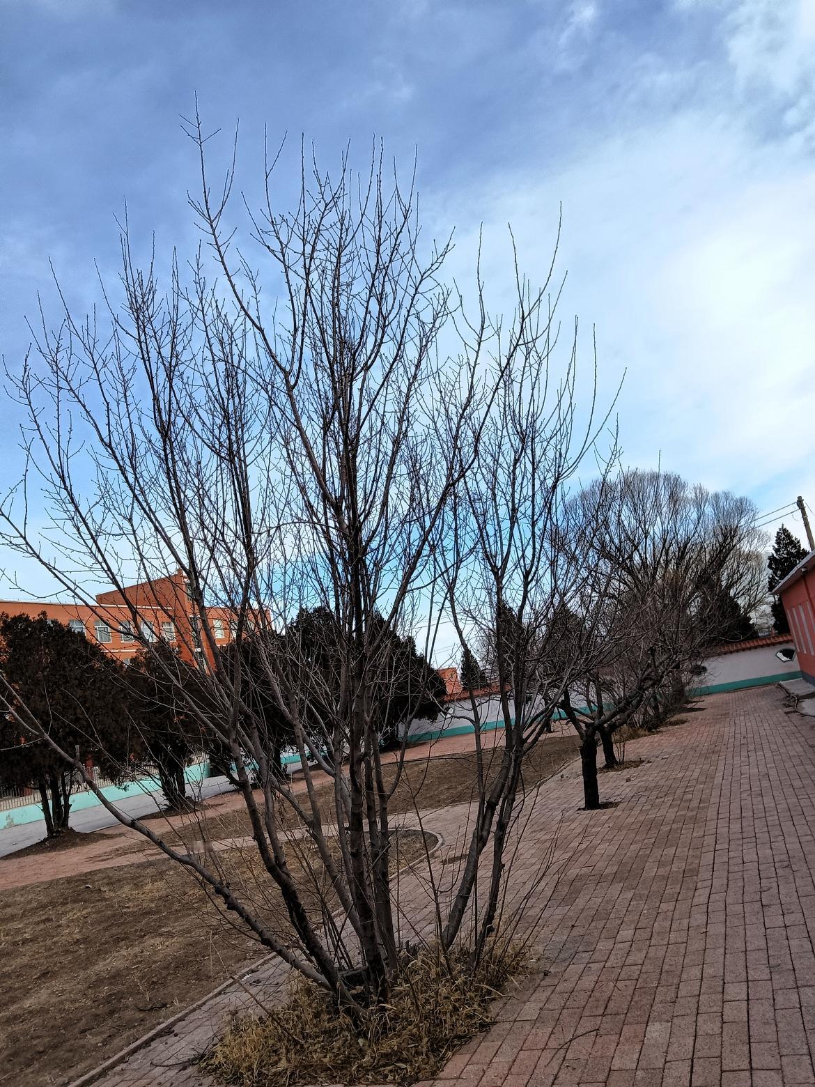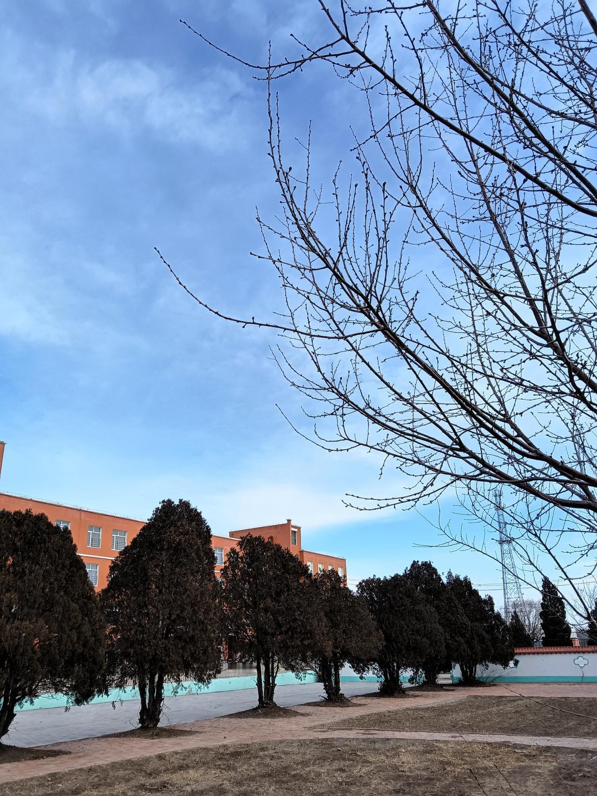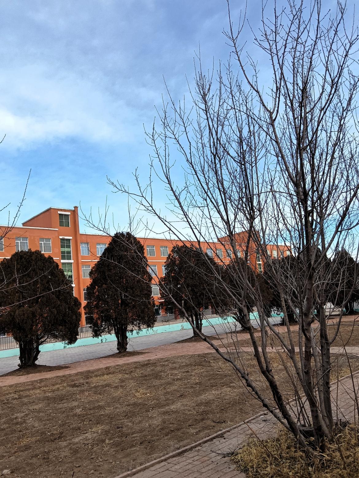 冬日校园,暖阳洒满橙楼,静谧的午后时光。校园里的树木和橙色建筑物好安静啊!校园风
