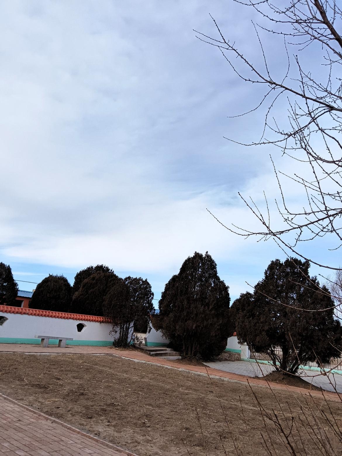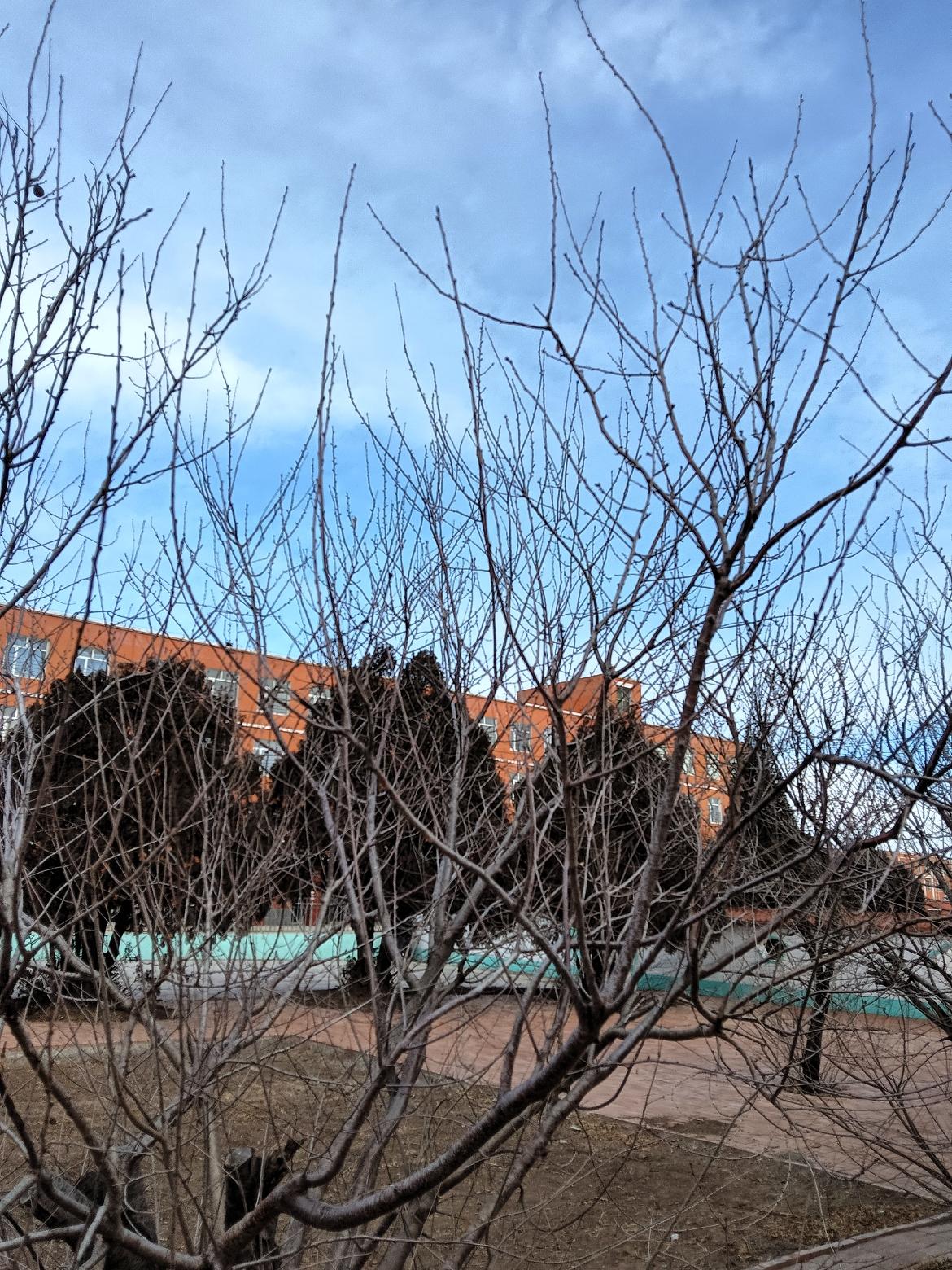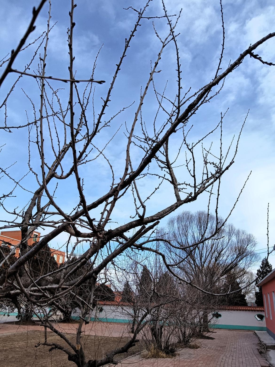 冬日校园,暖阳洒满橙楼,静谧的午后时光。校园里的树木和橙色建筑物好安静啊!校园风