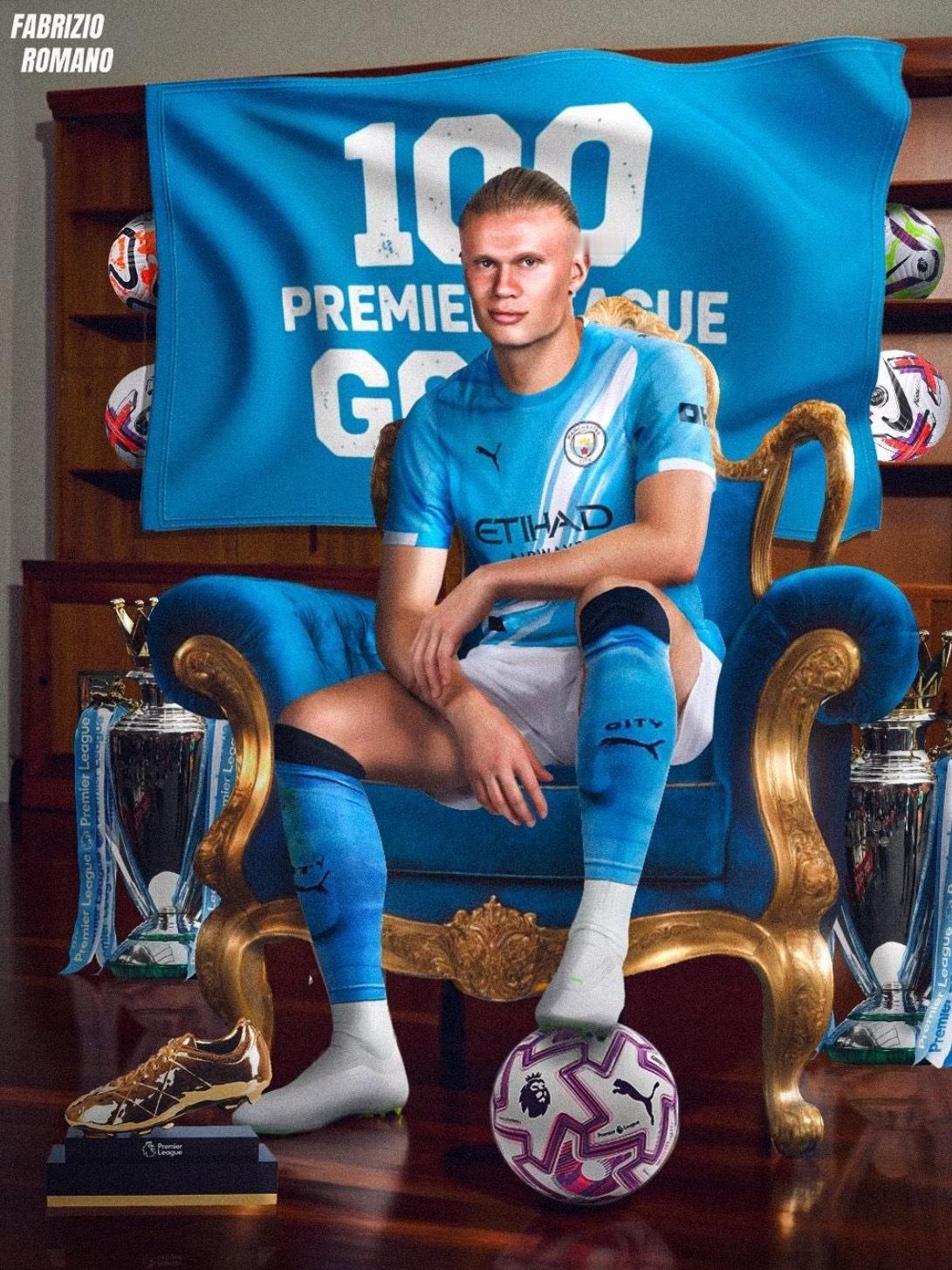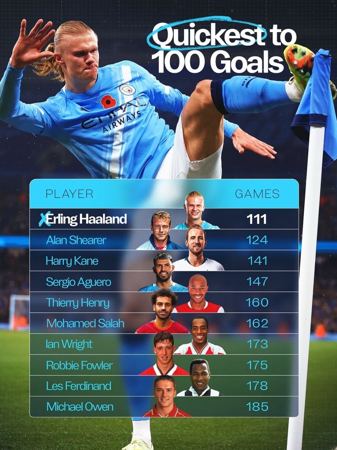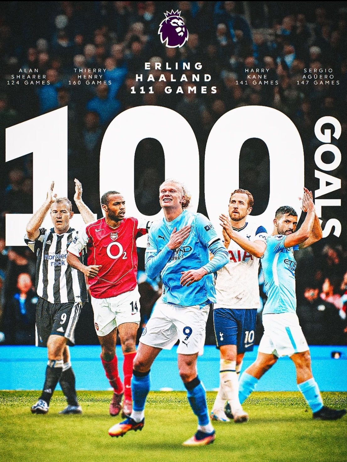 英超第14轮,曼城客场5-4战胜富勒姆。比赛第17分钟,哈兰德接多库传中推射破门,解锁英超第100粒进球。哈兰德111场比赛达成100粒进球,打破阿兰·希勒保持个124场百球记录,尘封30年的英超最快百球记录被改写,哈兰德成为新的英超历史最快百球先生。