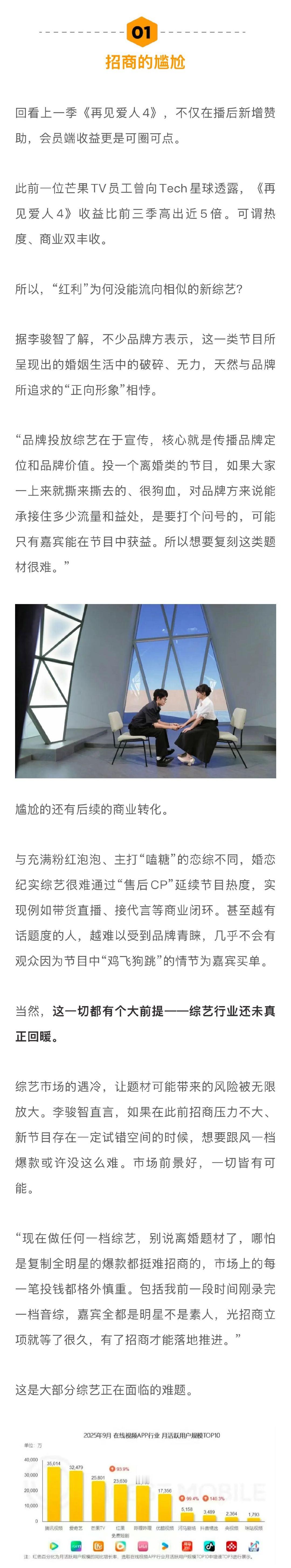 品牌方觉得离婚这事儿晦气 业内谈离婚综艺招商难 执掌过多档恋综的综艺导演李骏智告诉新浪娱乐工作室,业内曾有两个与《再见爱人》相似的提案,基本上都死在了招商环节, “品牌方觉得离婚这事儿晦气。” 尴尬的还有后续的商业转化。婚恋纪实综艺很难通过“售后CP”延续节目热度,实现例如带货直播、接代言等商业闭环。甚至越有话题度的人,越难以受到品牌青睐,几乎不会有观众因为节目中“鸡飞狗跳”的情节为嘉宾买单…娱理独家↓