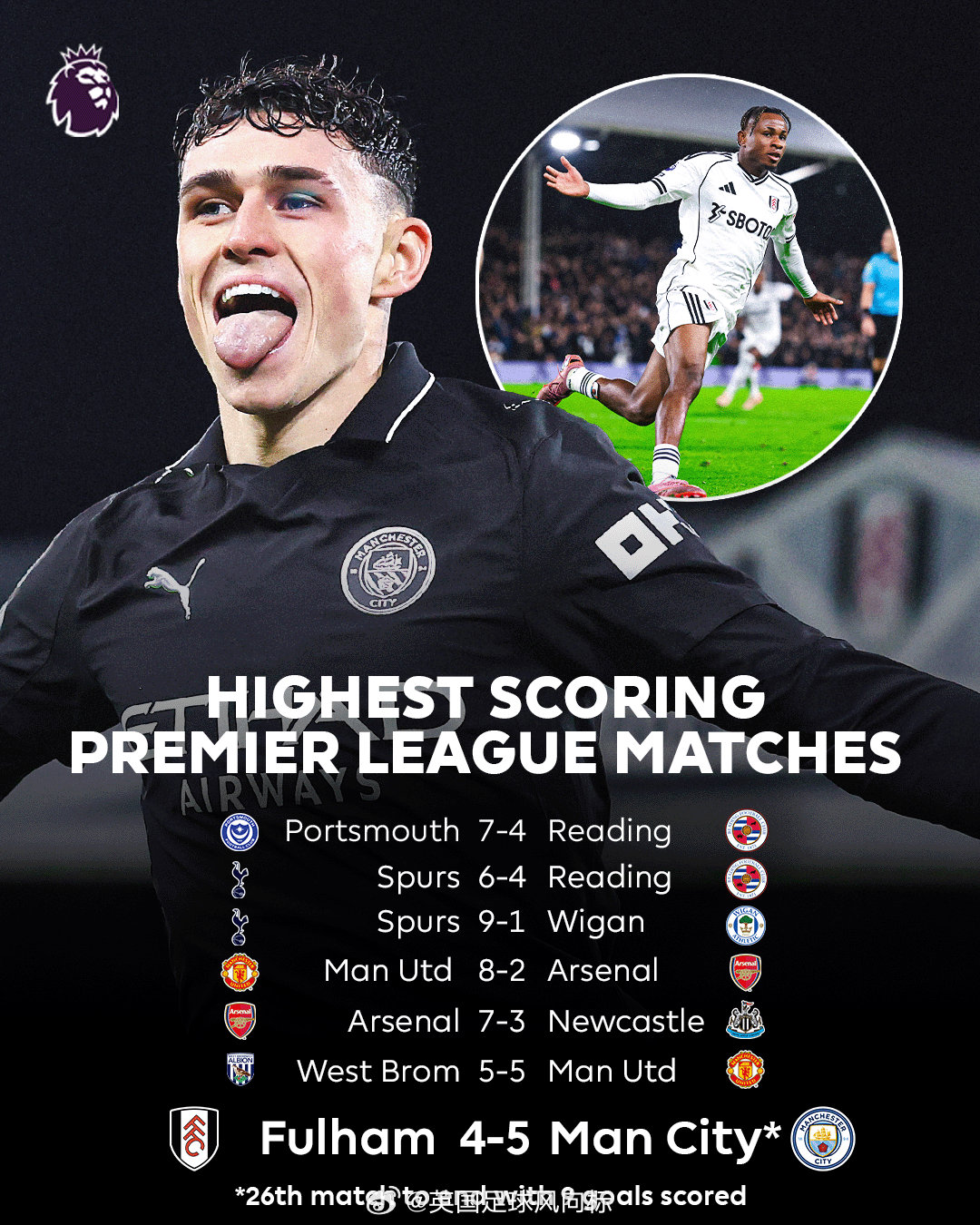 【英超史上进球最多的比赛】英超联赛史上,单场进球最多的比赛,是2007年9月的朴茨茅斯7比4雷丁,11球。单场进球达到10个的比赛一共有5场,包括弗格森爵士执教生涯最后一战的5比5平局,以及曼联在主场大胜阿森纳的那场8比2。至于曼城本轮作客5比4击败富勒姆,则是英超史上第26场单场进球达到9个的比赛。