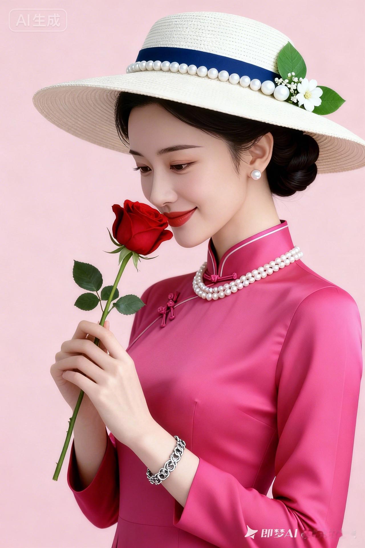优雅复古风,粉色旗袍与红玫瑰的完美搭配,尽显东方女性的魅力。