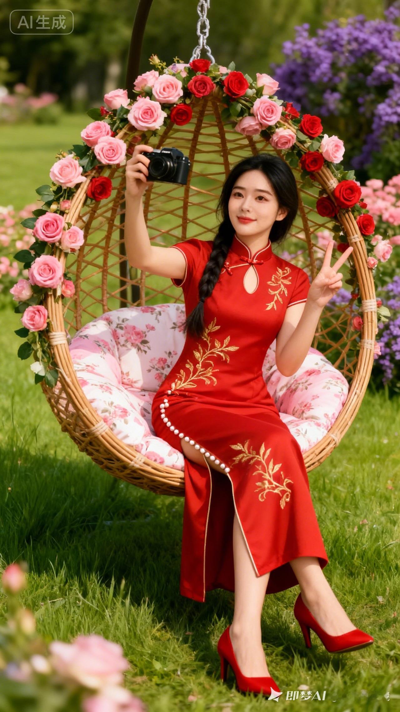 优雅复古风,粉色旗袍与红玫瑰的完美搭配,尽显东方女性的魅力。