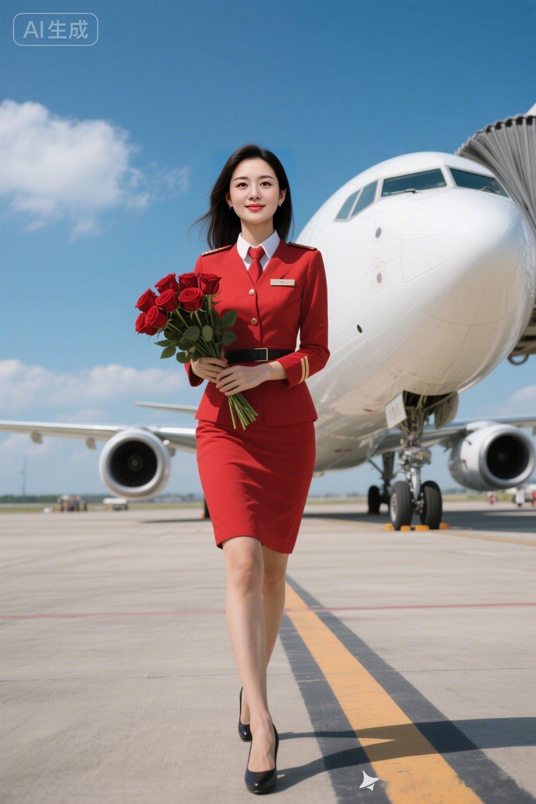 空乘小姐姐手捧红玫瑰,机场迎宾,元气满满的一天!🌹✈️