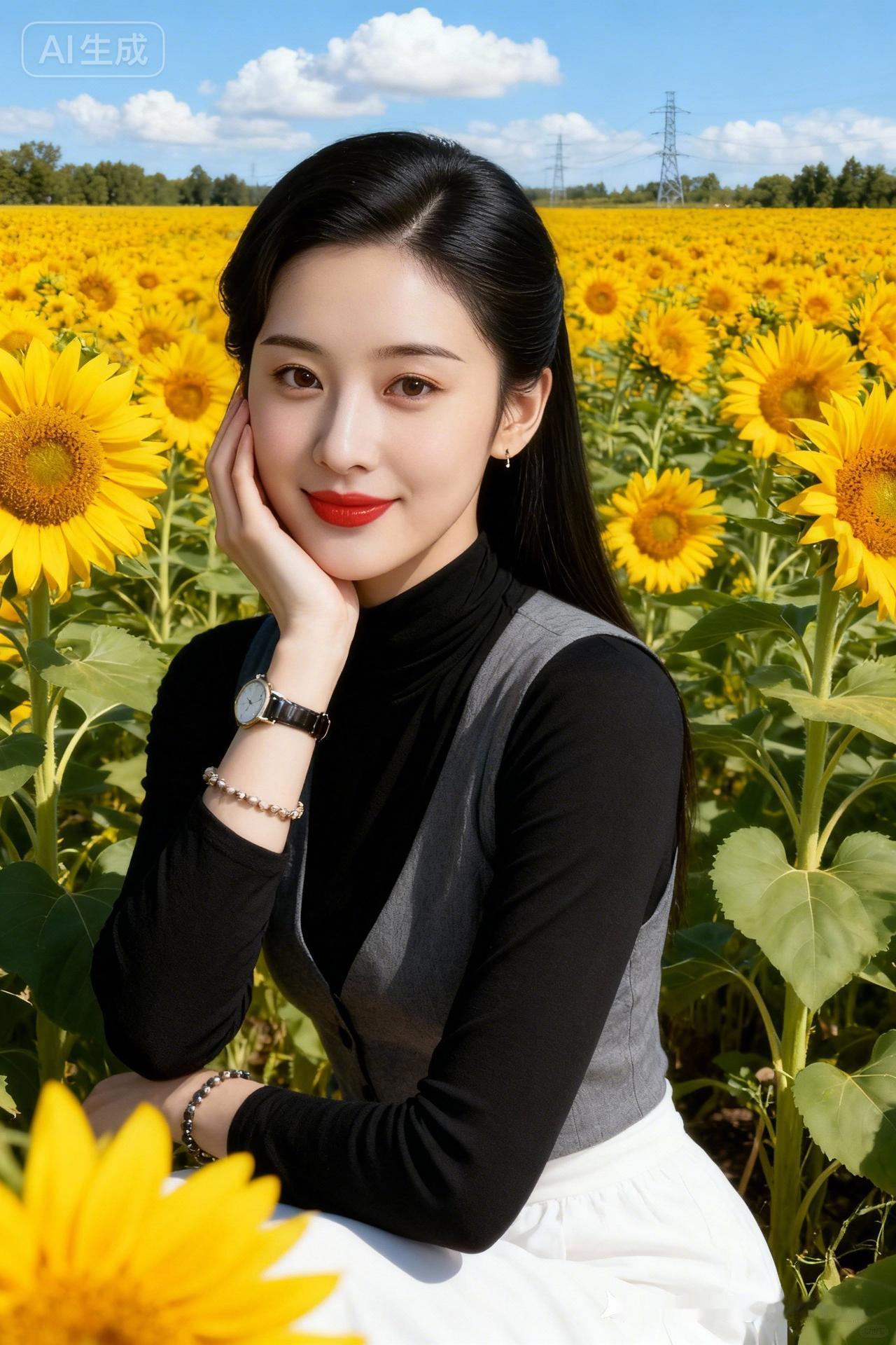 在向日葵花田中,微笑的少女与自然融为一体,感受阳光的温暖。