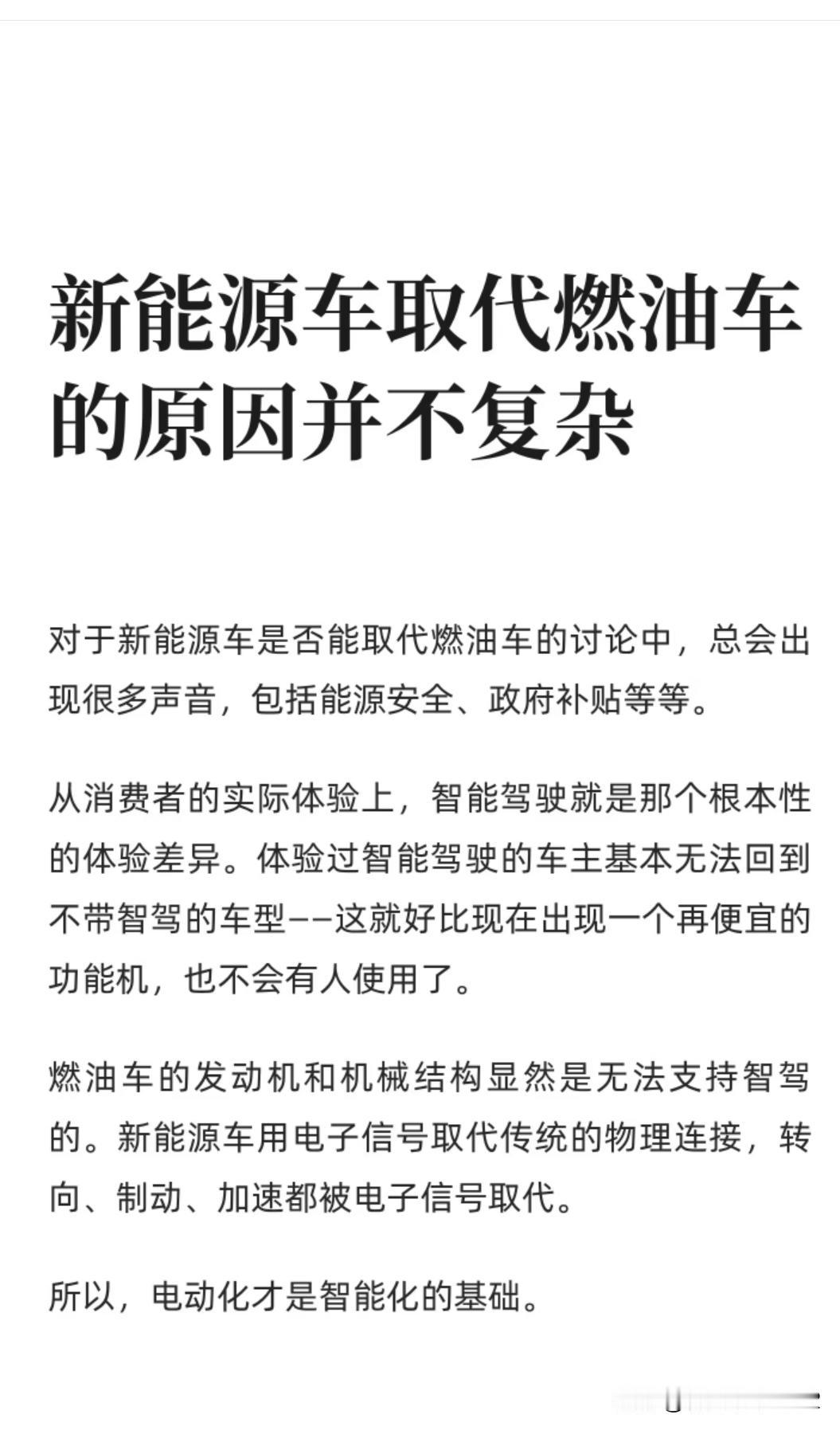 新能源车驾驶感觉优于燃油车的原因并不复杂。 对于新能源车是否能取代燃油车的讨论中,总会出现很多声音,包括能源安全、政府补贴等等。 从消费者的实际体验上,智能驾驶就是那个根本性的体验差异。体验过智能驾驶的车主基本无法回到不带智驾的车型——这就好比现在出现一个再便宜的功能机,也不会有人使用了。 燃油车的发动机和机械结构显然是无法支持智驾的。新能源车用电子信号取代传统的物理连接,转向、制动、加速都被电子信号取代。 所以,电动化才是智能化的基础。