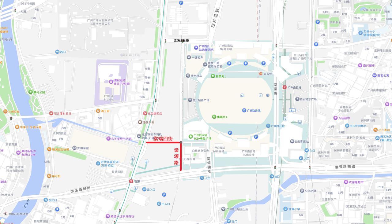 广州白云站西侧将新建两段道路,打通交通瓶颈 白云站周边道路完善工程(一期)项目涉及2条市政道路,总长约287米。 其中: 6号路(棠瑞四街)西延工程,西起石槎路,东至现状6号路(棠瑞四街),全长约134米,道路等级为城市支路,规划红线宽度20米,双向两车道,设计速度30公里/小时; 3号路(棠颂路)南延工程,北起现状3号路(棠颂路),南至现状潭溪路辅道,全长约153米,道路等级为城市次干路,规划红线宽度26米,双向四车道,设计速度40公里/小时。 建设内容包括道路工程、交通工程、给排水工程、照明工程、电力管沟工程、绿化工程等。 本工程估算总投资3644.95万元,其中,工程费用2373.09万元,工程建设其他费用1006.93万元,预备费264.93万元。资金来源为白云区财政资金。 目前,前往白云站西侧停车场,只能通过北侧的棠涌金堂路进出,且需要到棠颂路最南端掉头,十分不便。 棠瑞四街西延、棠颂路南延工程实施后,白云站西侧交通便利程度将大大改善,有助于缓解周边交通拥堵局面,给进出站旅客带来极大便利。 目前,白云站周边道路完善工程(一期)可行性研究报告已获批。