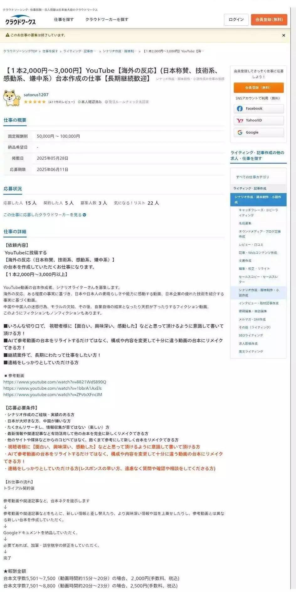惊了!日本一招聘网站竟公然挂出“抹黑中国人”的岗位,简直突破底线! 这个叫“云工作”的平台上,招聘方开出2000-4000日元薪酬,招募写手创作YouTube视频剧本,核心要求就俩:称赞日本人、抹黑中国人!还得把现成视频改头换面,假装是原创内容。 更气人的是,这不是第一次了!招聘方之前就多次招人为“抨击中韩”写稿,妥妥的惯犯。 事件发酵后,网站紧急下架了信息,还甩锅给AI审核漏洞,说没识别出违规。但日本网友都看不下去了,直言“作为日本人感到耻辱”,吐槽这种操作只会加剧对立,完全不理性。 其实这事儿也不是个例,之前日本驻英使馆曾每月花1万英镑收买智库抹黑中国,TBS电视台也做过抹黑中国人的综艺,全是刻意煽动对立的套路。 全球化时代,相互尊重才是相处之道,靠虚构剧本搞抹黑、挑矛盾,既不体面也不道德。这种故意破坏国家间信任的操作,真的太掉价!