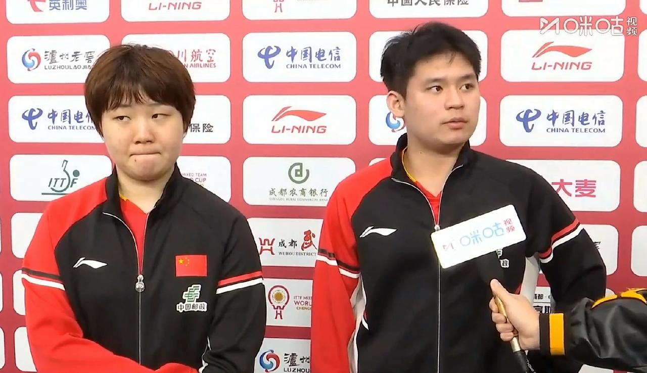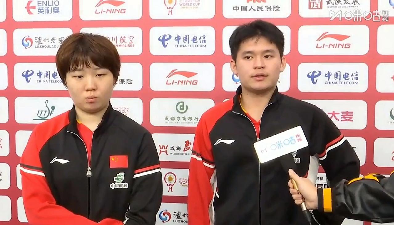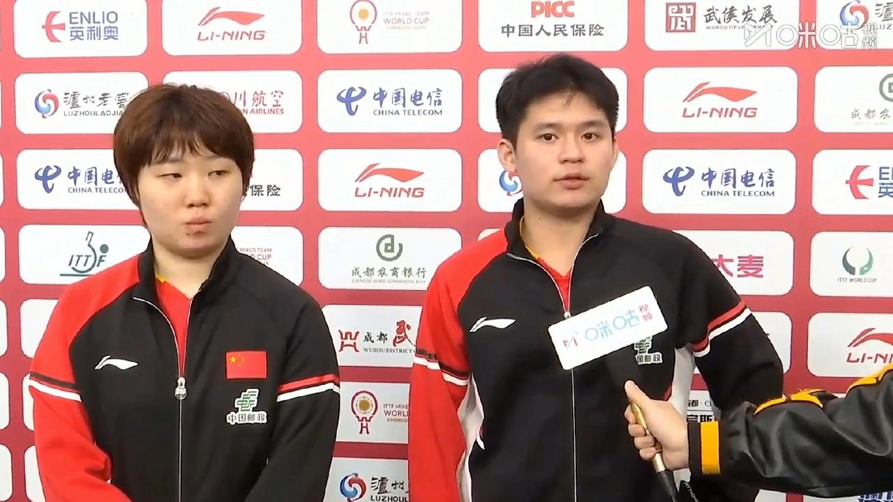 混团拜访, 蒯曼的回答没啥问题, 林诗栋说我们两个人的沟通感非常好,听着有点小意外,看来蒯曼的小嘴撅的值了, 在采访中,蒯曼先称赞了对手,整体的质量和前三板上都非常强,又谈了谈之所以能取胜,可能是因为前三板做的比较好, 随后到了林诗栋,他开始也是称赞对手,后来看着蒯曼的表情,又话锋一转说,其实我们的调动还是不错的,整个人的积极性还有我们两个人在场上的沟通感都非常的好, 听着林诗栋的回答,蒯曼也会心的笑了笑,这回答还算不错! 呵呵,多可爱的蒯曼,继续加油!