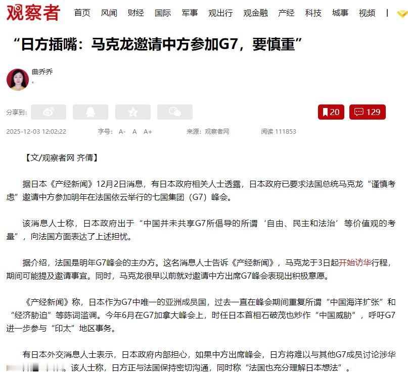 日本真是“飘了”,居然公开警告法国! 日本《产经新闻》12月2日报道,日本政府相关人士向该报透露,日本政府已向法国总统马克龙提出,希望其“慎重考虑”是否邀请中国参加明年在法国依云举办的七国集团(G7)峰会。 这位消息人士还表示,日本政府之所以有此担忧,是因为认为中国与G7所倡导的所谓“自由、民主和法治”等价值观不符。 据悉,法国是明年G7峰会的主办国。上述消息人士进一步告知《产经新闻》,马克龙从12月3日起开启访华之旅,此行或许会提及邀请中国参会的相关事宜;而且马克龙早有邀请中国出席G7峰会的积极意向。 看到日本跳出来管马克龙邀请中国参加G7峰会的事,说实话,真让人又气又好笑。 人家法国是主办方,邀请谁是人家的自由,关日本什么事?还拿什么“自由、民主、法治”当借口,说中国不认同这些。 想想就可笑,日本连自己二战侵略的历史都不敢认,还敢跟我们谈这些? 说白了,它就是没安好心,怕中国去了,它在G7里抹黑中国的小算盘打不成,日本这借口根本站不住脚。真正的好价值观,是尊重别的国家,不瞎插手别人的事,说话算话。 可日本呢?前两年不顾大家反对,硬把核污染水排进大海,这不是害全人类吗? 还有每年都有日本政客去拜靖国神社,里面全是二战战犯,手上沾着亚洲人民的血,还动不动否认南京大屠杀,这样的国家,有什么资格谈价值观? 再说G7内部也不是一条心,美国和欧盟经常互相拆台,日本拿这个当借口反对中国参会,纯粹是骗自己。 反过来讲,马克龙邀请中国参会,不是脑子一热,是真务实。以前G7是“富国俱乐部”,能说了算,现在不行了,全球很多事离了中国办不成。比如经济复苏、能源安全这些难题,没有中国参与根本解决不了。 而且中国市场对很多G7国家很重要,像德国的奔驰、宝马,差不多一半销量靠中国,法国的空客飞机也在中国卖得很好。 马克龙请中国,就是想拉着中国解决问题,也帮法国自己发展经济,这是明眼人都能看明白的事。 日本急着反对,真实心思很明显,就是想把G7当成反华的工具,怕中国去了戳穿它的真面目。 它总在G7里挑事,炒作台海、南海问题抹黑中国,怕中国来了,其他国家就看清它的把戏了。 可日本忘了,现在不是少数几个富国说了算的年代了,中国的影响力越来越大,很多国际会议都离不开中国。 不管是APEC还是G20,中国提出的合作倡议都受大家欢迎,这不是日本能挡得住的。 说到底,马克龙邀请中国是顺应潮流,日本的插嘴根本没用。要是日本还看不清形势,继续跟着美国针对中国,最后只会被大家孤立,自讨苦吃。
