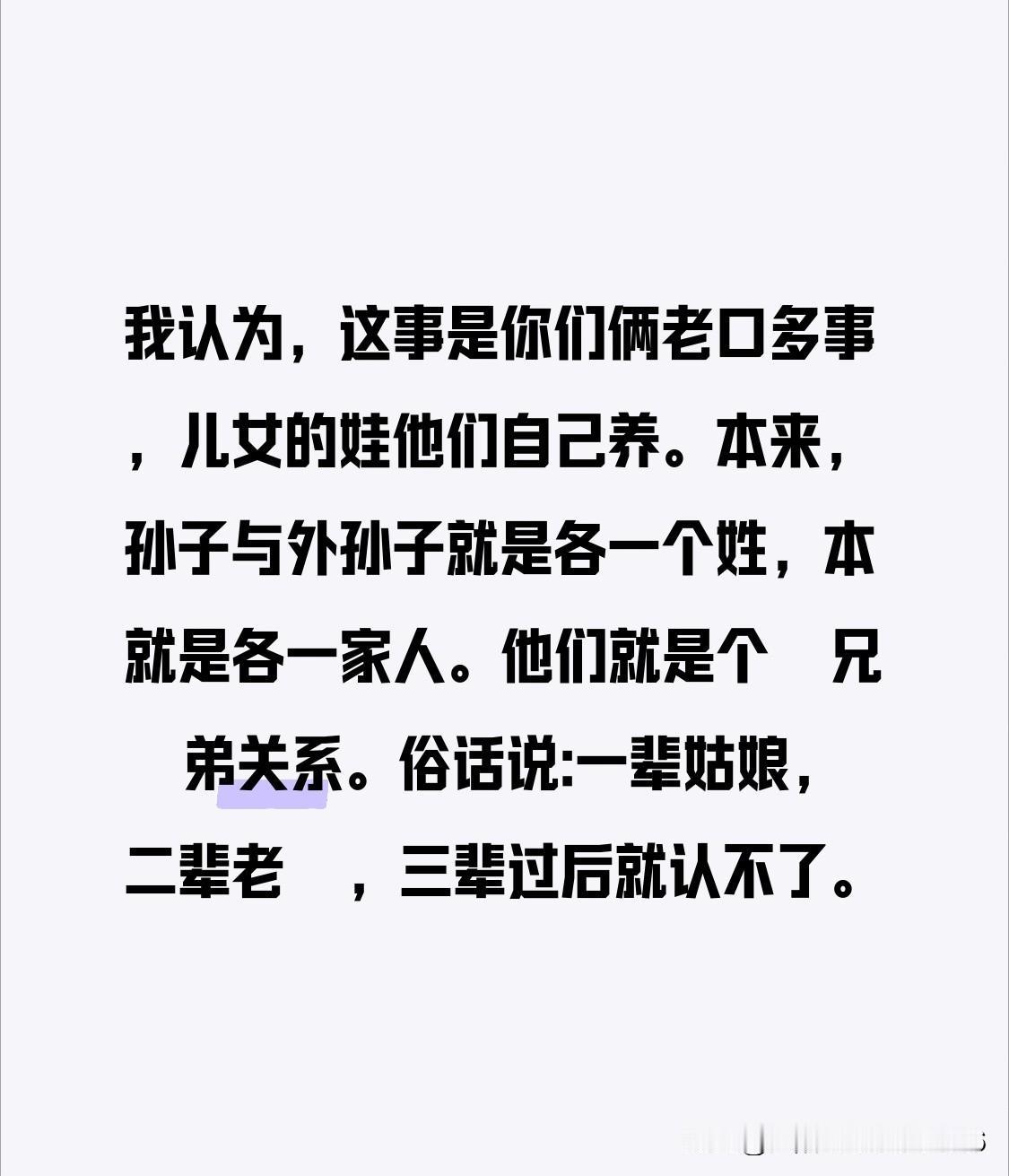 我认为,这事是你们俩老口多事,儿女的娃他们自己养。本来,孙子与外孙子就是各一个姓,本就是各一家人。他们就是个俵兄俵弟关系。俗话说:一辈姑娘,二辈老俵,三辈过后就认不了。
