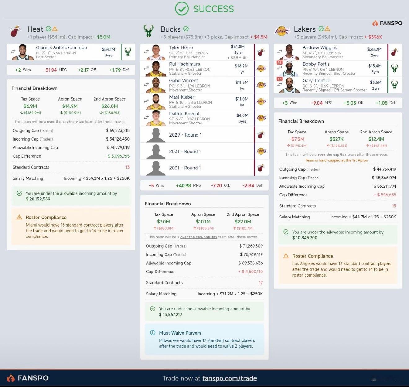 字母哥深陷交易流言,国内网友模拟了一个热火、雄鹿、湖人的三方交易:热火送出:希罗、维金斯、两个首轮热火得到:字母哥雄鹿送出:字母哥、波蒂斯、特伦特雄鹿得到:希罗、八村塁、文森特、克莱伯、克内克特、三个首轮湖人送出:八村塁、文森特、克莱伯、克内、一个首轮湖人得到:维金斯、波蒂斯、特伦特热火意义:得到字母哥提升球队上限。雄鹿意义:收期合同+年轻主力+重建选秀权。湖人意义:内线外线增强攻防即战力。注意事项,雄鹿波蒂斯和特伦特需要到12月15日之后才能解锁交易。你觉得这个方案如何?