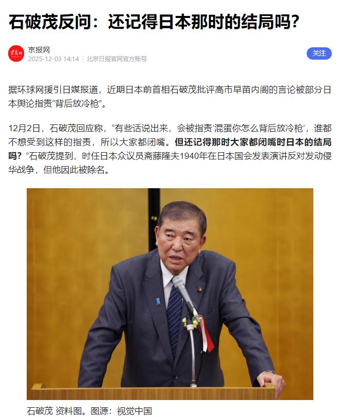 批评高市,被日本人骂“放冷枪”的石破茂直接硬核回怼:还记得日本当年的结局吗? 石破茂屡次公开批评日本首相高市早苗,说她不该在台湾问题上胡言乱语,还直言中日关系变僵,高市早苗得负主要责任。 这话一出口,好多日本媒体和网友就炸了,纷纷指责他是“在背后捅刀子、放冷枪”。 据日本《日本体育报》12月2日的报道,石破茂在一档广播节目里直接回怼这种指责:“要是所有人都闭上嘴不吭声,日本将来会走到哪一步?”他还吐槽道:“难道在自民党里,连说句真话都不行了吗?只要敢发声,就被骂成放冷枪,谁都怕挨骂,干脆就都闭嘴了。可大伙儿全当哑巴,日本能有好下场吗?” 其实他这话里藏的就是二战的教训,说得太在理了!石破茂这哪儿是放冷枪啊,分明是给那些被右翼思想带歪的日本人提个醒、敲警钟。 告诫他们别忘了当年就是因为所有人都沉默,才落得惨败的下场,要是再犯老毛病,早晚得重蹈覆辙。 二战时日本就是因为所有人都不敢说话,才让军国主义把国家拖进了毁灭的坑。那时候军国主义政府为了打仗,疯狂打压敢反对战争的人,谁说实话就抓谁。 日本有史料记载,1937年卢沟桥事变后,政府用军法抓了33个敢说真话的人,遍布全国。 有个28岁的朝鲜司机从上海回日本,在小饭馆、旅馆跟几个人说上海打仗特别惨,日本兵死了好多,江上全是尸体,结果就被人告发抓起来了。 那时候的日本,不光说实话会被抓,连半点不同意见都不敢有。政府藏着战争真相,媒体全是美化侵略的谎话,老百姓要么被蒙在鼓里,要么知道不对也不敢吱声,怕惹麻烦。 可就是这股沉默劲儿,让军国主义越来越疯狂,最终自食恶果! 再看看现在的高市早苗,还有那些骂石破茂的人,跟当年简直一个样。高市早苗11月在国会说,“台湾有事”要是动了武力,可能算日本的“存亡危机”,明着把台湾当自己的地盘。 完全不管一个中国原则,还拿无效的条约狡辩,故意忽略证明台湾是中国的历史文件,就是在挑衅中国。 石破茂站出来批评她,说外交问题不能瞎说话,还强调没中国,日本都难立足,这根本不是放冷枪,是有良心、懂历史的政治家该做的事。 要知道现在日本经济离不开中国,吃的、稀土、药这些关键东西好多都从中国进口。 高市早苗的疯话已经让中日关系紧张了,再这么闹下去,贸易、民间交流都受影响,最后坑的是日本老百姓。 可就这正义的批评,还被好多人骂“背后捅刀”,这跟当年打压反战声音的军国主义有啥区别? 更让人担心的是,现在日本不光高市早苗瞎闹,还有不少亲台的人煽风点火,跟美国搞夺岛演练,制定应对台海的作战计划,往台湾问题上凑。 这些事本来就危险,可日本没多少人站出来反对,反而有人跟着起哄,这就是全员沉默的苗头啊。 石破茂的反问,就是要戳破这危险的沉默,不让当年的悲剧重演。历史教训就在眼前,石破茂问得好,全员沉默只会让日本再遭灾难。 希望更多日本人能像他一样站出来,认清真相,别再沉默着走向毁灭,毕竟和平来得不容易,丢了就找不回来了。