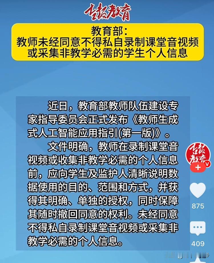 教育部最新发布的《教师生成式人工智能应用指引(第一版)》,为课堂音视频录制、学生信息采集划下了清晰红线。未经学生及监护人授权,教师不得私自采集非教学必需的个人信息;分析成绩时要对敏感数据脱敏,严禁数据出售、牟利或歧视。 教育数字化从不是“无底线”的技术滥用,这份指引既是对教师教学行为的规范,更是对学生隐私的硬核守护。让AI服务教育的同时,把数据安全的闸门把牢,才能让技术真正成为育人的助力,而非隐私泄露的隐患。 ai人工教育 ai教学模式 教师人工智能 ai赋能教师 ai教学平台 教师ai 教师教育信息化