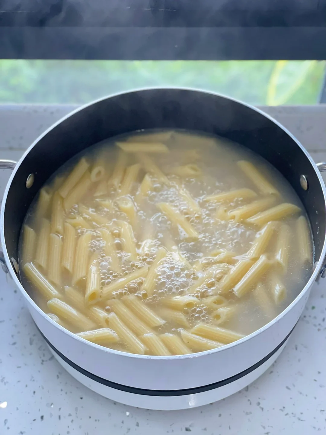 3️⃣加入罗勒番茄酱拌匀煮沸