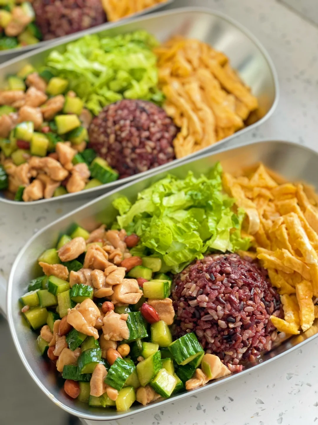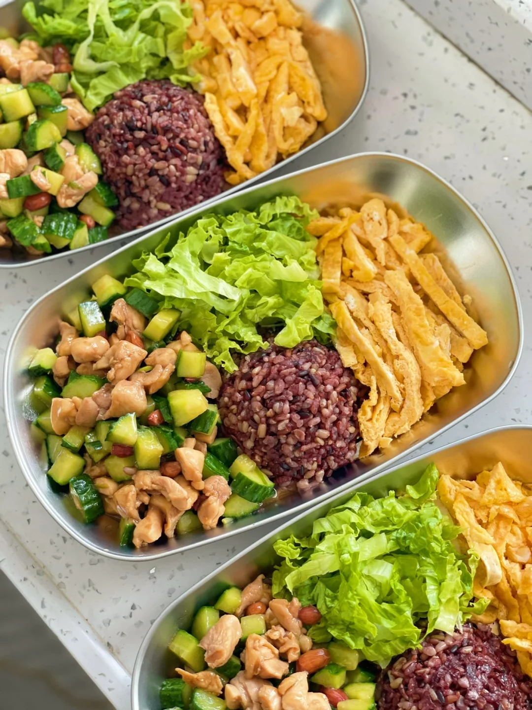 热气腾腾的三餐 🌟低卡餐宫保鸡丁 去皮鸡腿肉|黄瓜|花生|蚝油|生抽|玉米淀粉|葱白 1️⃣鸡腿肉用蚝油、生抽腌制 2️⃣黄瓜切丁备用 3️⃣锅热油把葱白炒香,加入鸡腿肉煎至两面金黄 4️⃣加入黄瓜丁炒匀,蚝油调味 5️⃣加入花生,玉米淀粉兑清水勾芡就可以啦 ❤️喜欢吃辣的还可以在炒白菜的时候加一勺郫县豆瓣酱,今天做的是咸香口味会比较清淡一些 🌟生菜切丝(蔬菜) 🌟鸡蛋煎熟再切成鸡蛋丝(蛋白质) 🌟今日碳水:杂粮饭