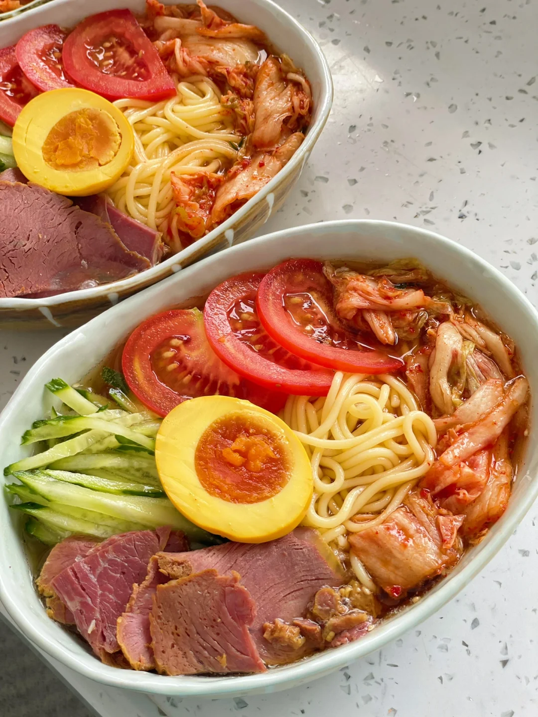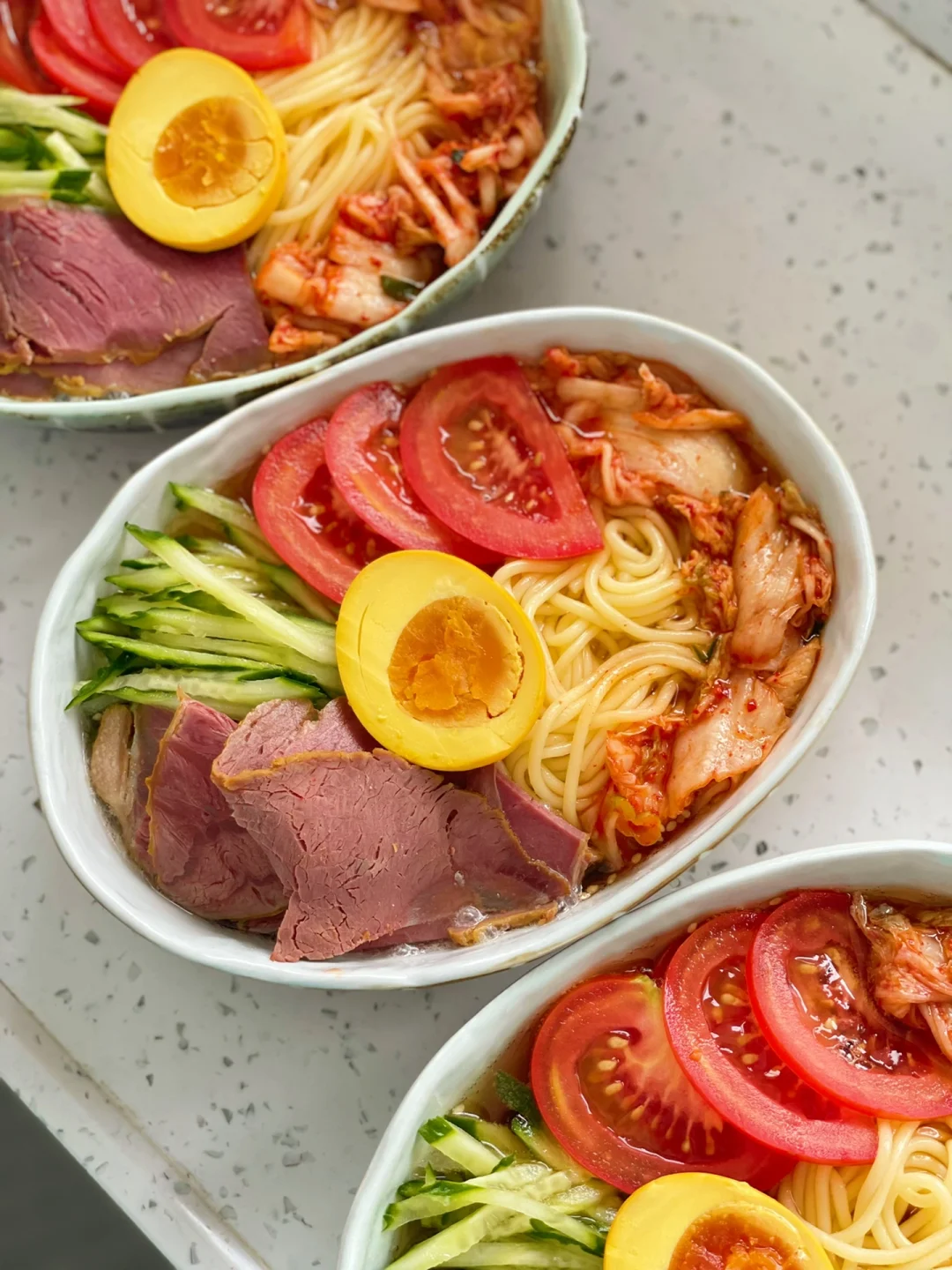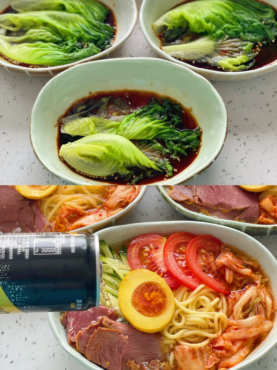5️⃣冷却的玉米面、黄瓜丝、西红柿、卤牛肉、泡菜、鸡蛋摆好,加入一罐冷冻的无糖苏打水就可以啦