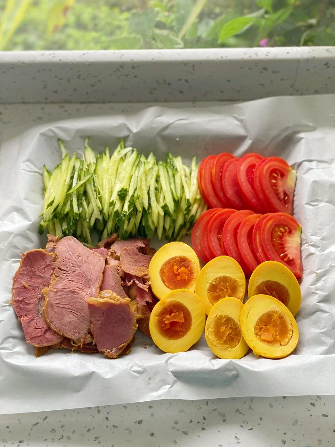 2️⃣黄瓜切丝、西红柿切片、卤蛋对半切开