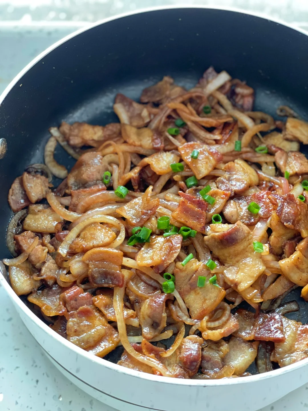 1️⃣五花肉切成薄片,放在锅中煎至两面金黄,把肥肉中的过多油脂煎出