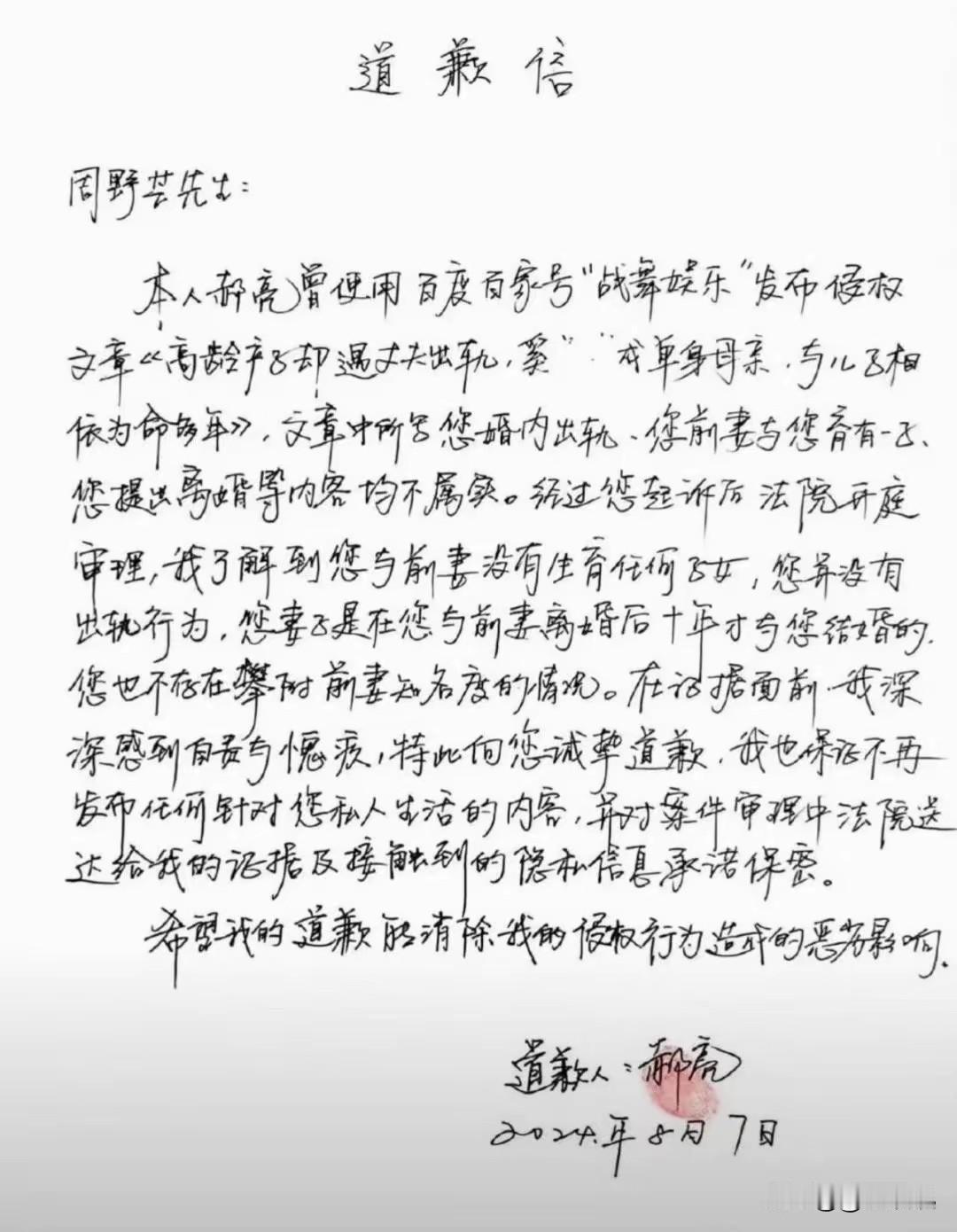 周野芒,与前妻奚美娟没有生子女,而且婚内出轨的也不是他。 他是与前妻离婚十年后才和现任妻子结婚的,这事可是经过官方权威认证的,有网友的手写道歉信为证。 真相虽迟了三十年,但还是到来了! 周野芒老师还真的是能忍,一直被传是在前妻奚美娟坐月子时因他爱上别人而抛妻弃子的,被戴着渣男的帽子三十年,被骂了三十年,人设稀烂,他也没有发文揭露事件的真相。 要不是此事已影响到现在的家人和工作了,他估计还不发声,还愿意忍下去。 他现在辟谣也只是简单地说明自己与前妻没有孩子,也就是委婉地说明,奚美娟在与他婚内所生的孩子不是他的,所以离婚了不是抛妻弃子。 他没有用激烈的语言的去指责前妻出轨,更没有去曝孩子的生父,那个可恶的入侵者。 从中可以看出,不管是过去还是现在,周野芒还是很顾及前妻及她的孩子的体面。 他是一个大胸怀大格局的善良之人,他应该曾深深地爱过前妻,所以一直不忍去指责前妻,怕影响她完美的人设,情愿自己挨骂,而前妻却心安理得的成了德艺双馨的艺术家。