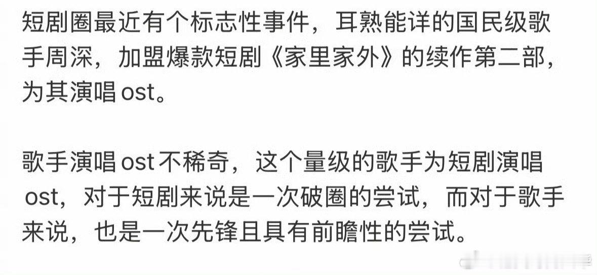 啥样的短剧能把周深请过来 看《家里家外2》就知道!能把“ost霸主”从幕后请到台前,既懂观众耳朵又懂剧的氛围,这波操作直接让短剧质感飙升,周深一开口就破防!
