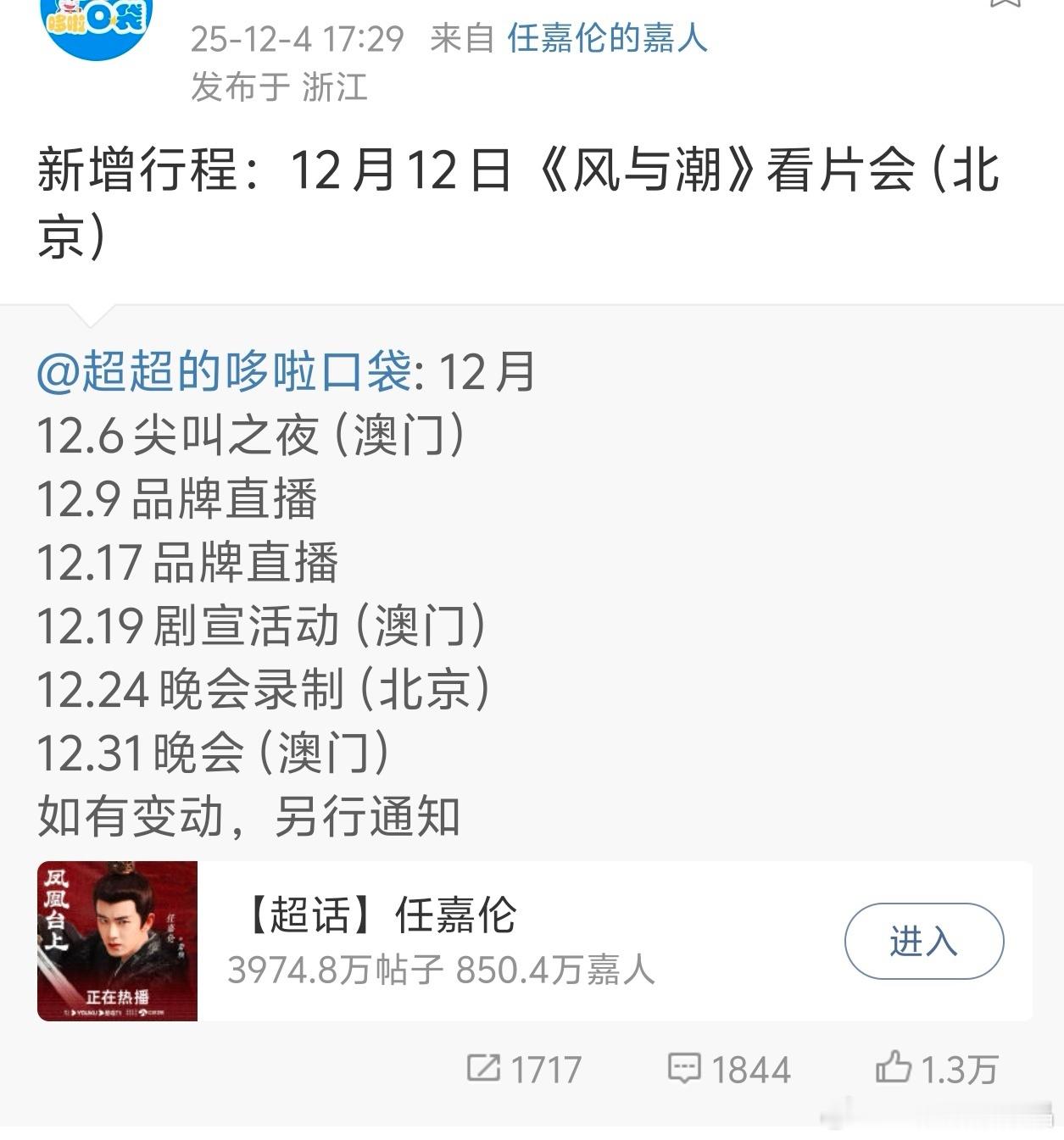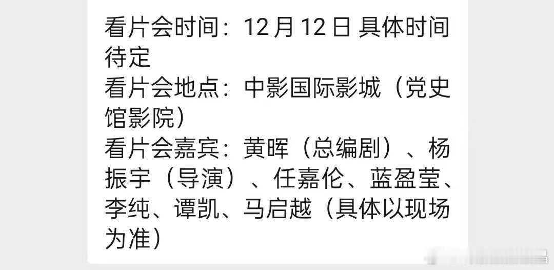 电视剧《风与潮》看片会时间:12月12日具体时间待定看片会地点:中影国际影城(党史馆影院)看片会嘉宾:黄晖(总编剧)、杨振宇(导演)、任嘉伦、蓝盈莹、李纯、谭凯、马启越等。任嘉伦风与潮