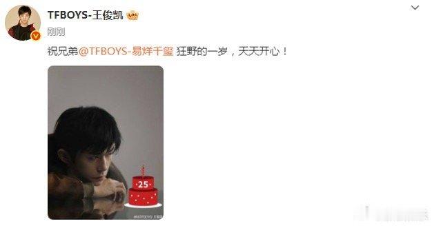 王俊凯祝易烊千玺狂野的一岁天天开心王源王俊凯为易烊千玺庆生 王俊凯晒照喊易烊千玺“狂野的一岁天天开心”,王源也评论送25岁美好祝福,三小只的神仙友情从来不让人失望✨